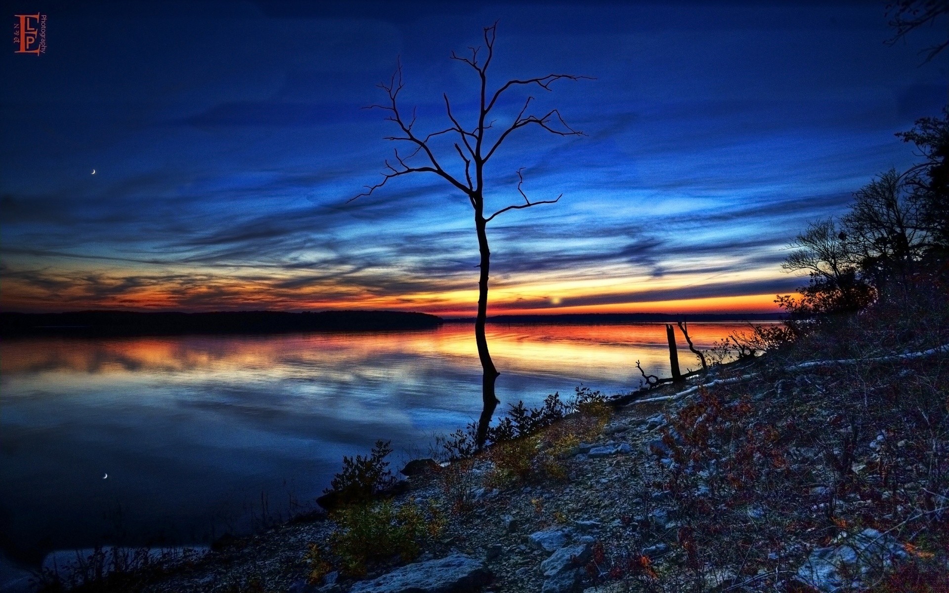 Pôr do sol no fundo do mar e uma árvore solitária