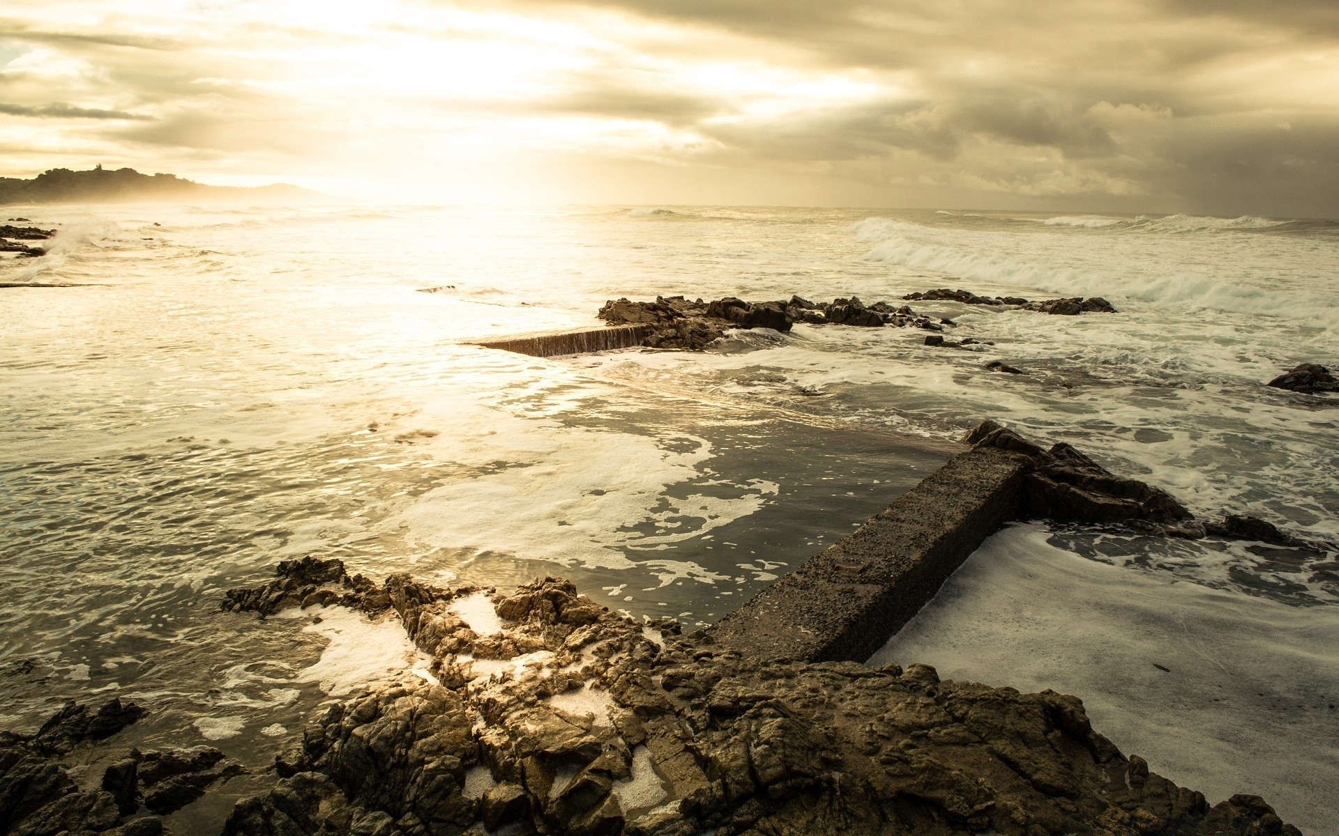 Imagem de ondas com recifes no fundo do pôr do solImagem de ondas com recifes no fundo do pôr do sol