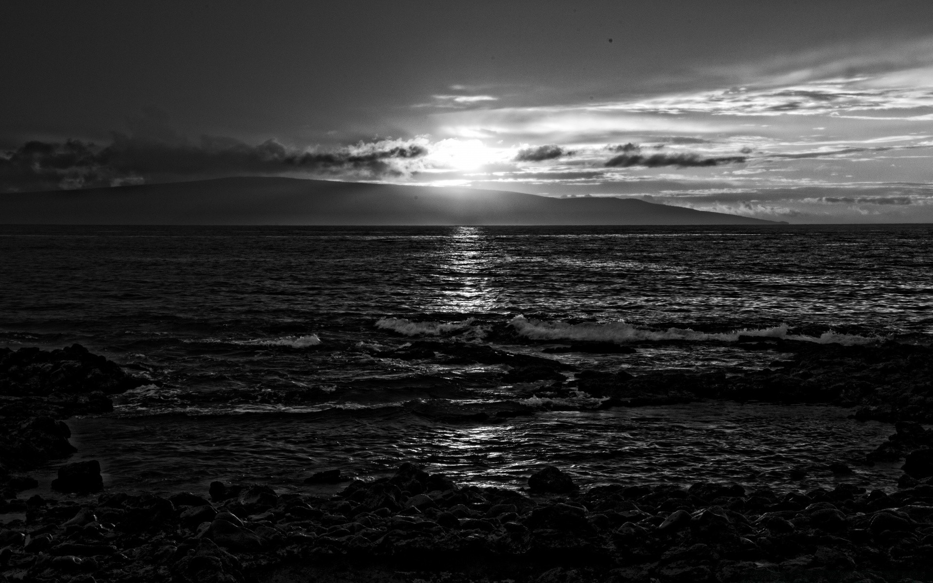 Foto em preto e branco da água do mar da praia no fundo do pôr do sol