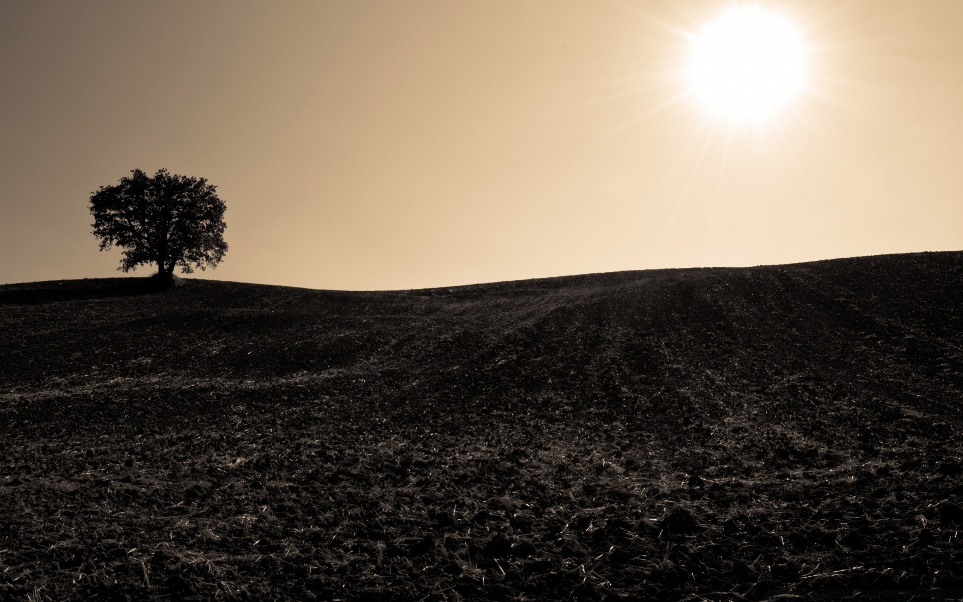 Campos escuros e uma árvore em Dalí no fundo do sol
