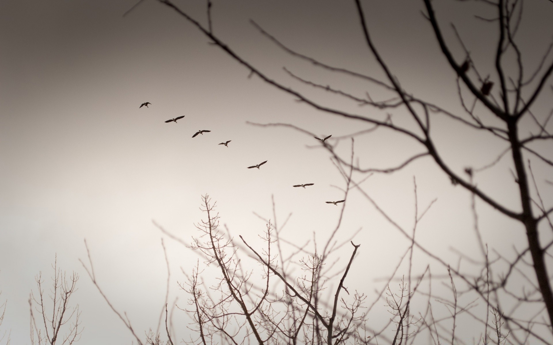 Ébano e arbustos no fundo do céu branco com pássaros voadores