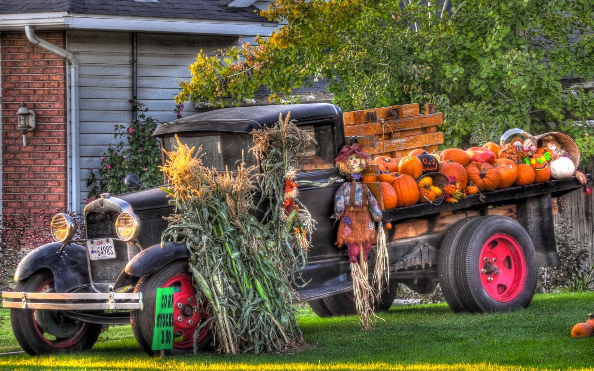 Carro retro decorado para o Dia Das Bruxas com bonecas, polias e abóboras