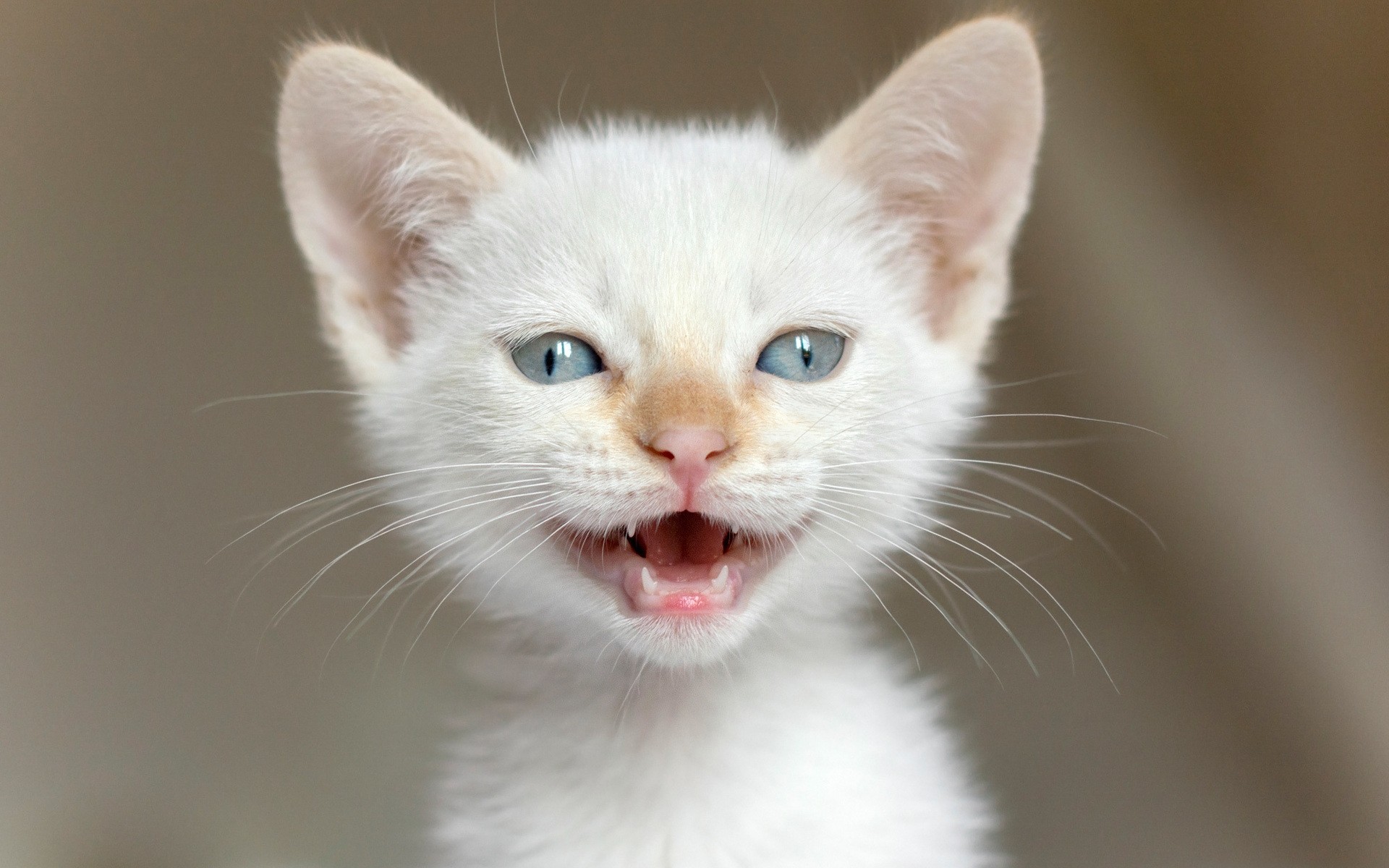 Gatinho branco e magro abre a boca