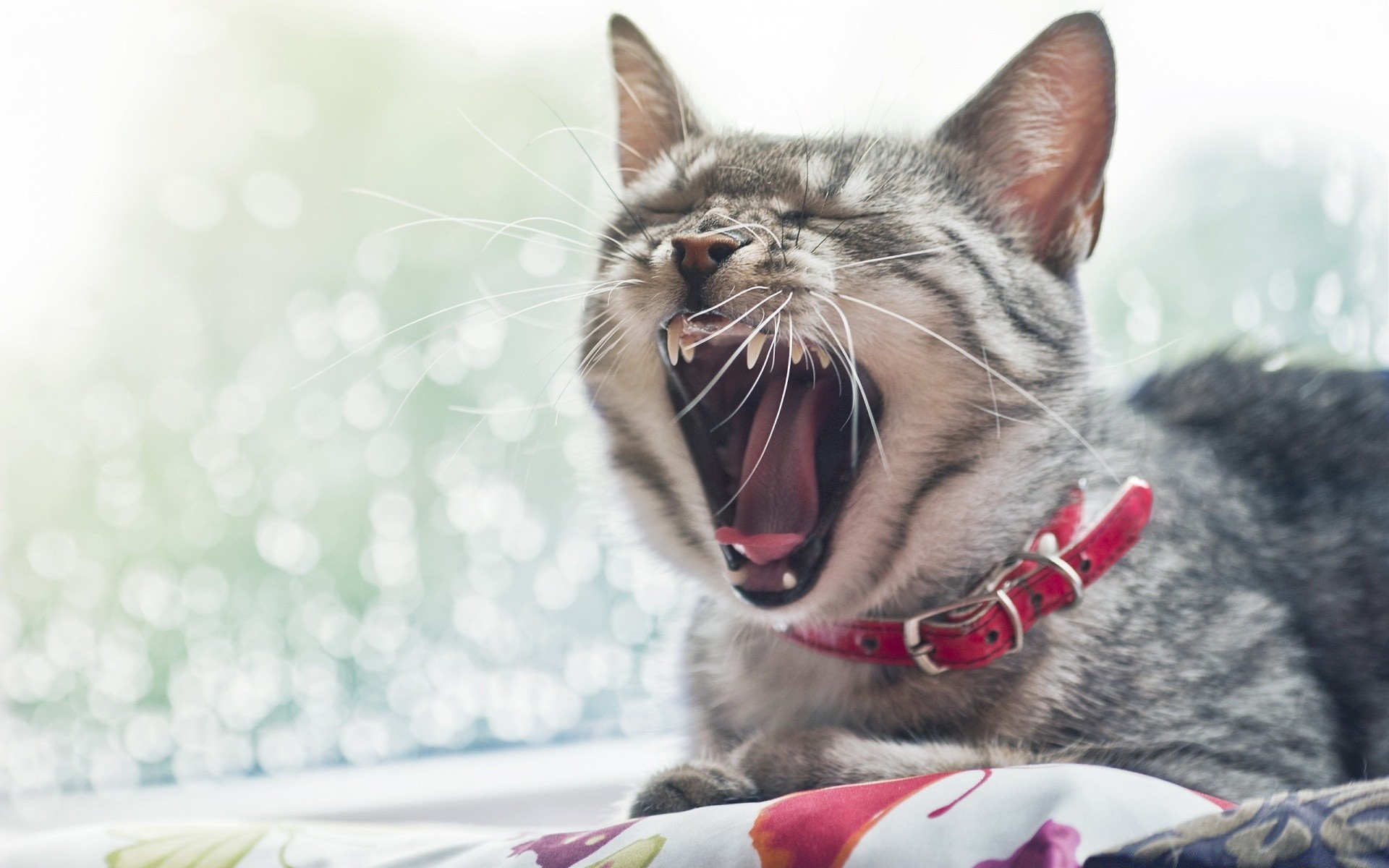 Gato bocejando deitado no peitoril da janela