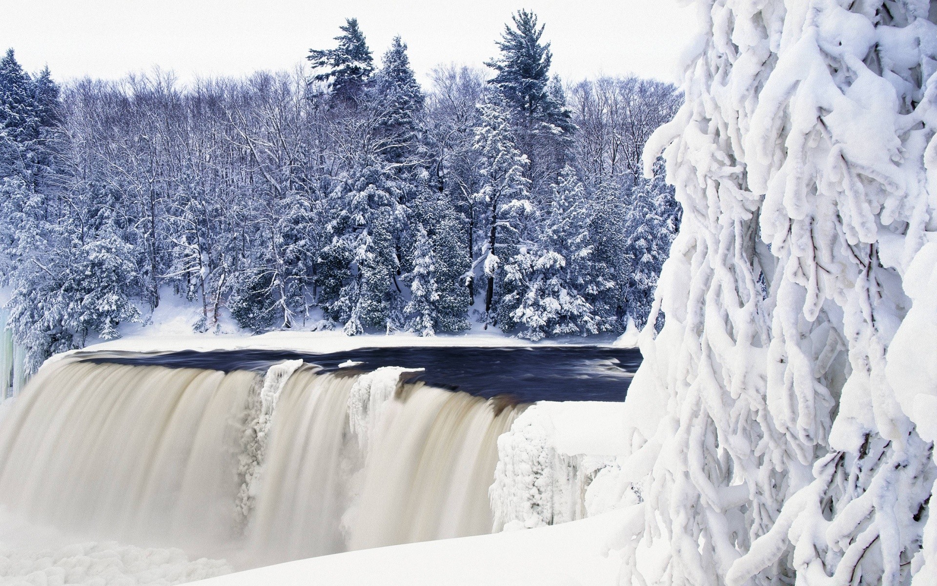 Paisagem Inverno rio árvores de Natal ramos muita neve