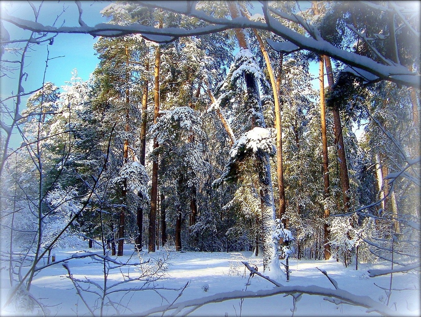 Inverno ensolarado. Geada branca nas árvores. Rio congelado