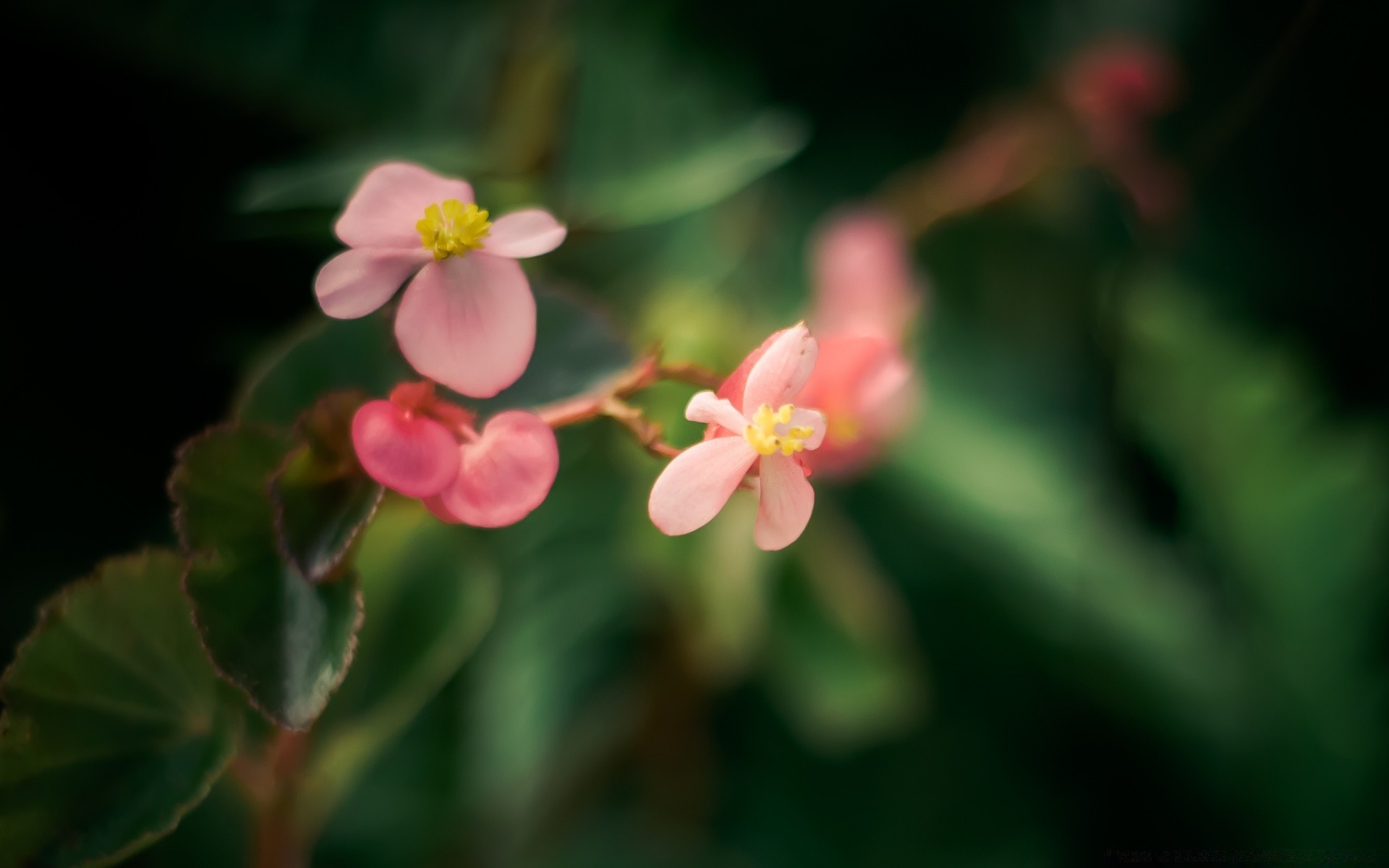 Flores com folhas cor-de-rosa contra um fundo verde escuro