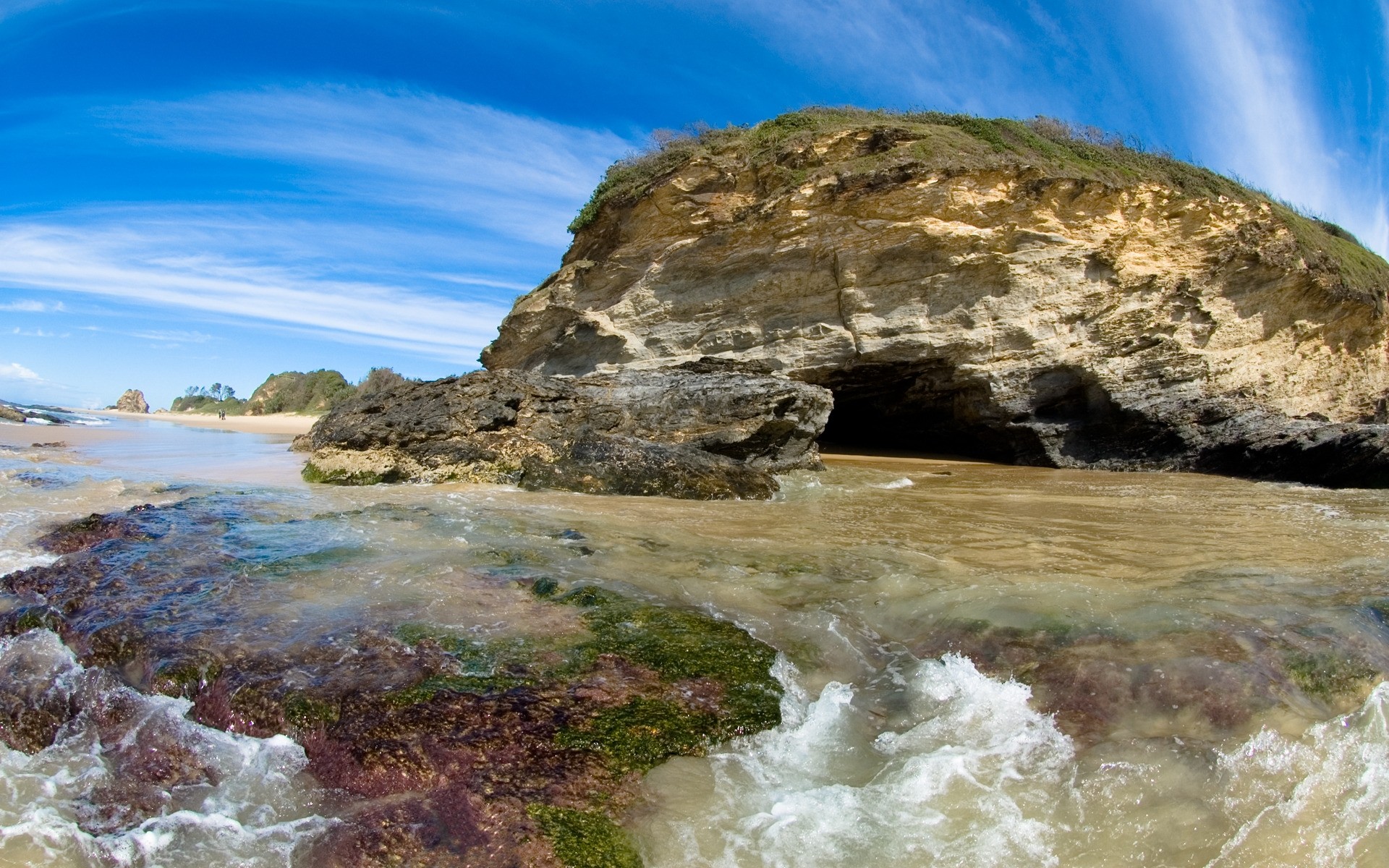 Praia rochosa do mar, céu do pôr do sol, névoa leve sobre a água