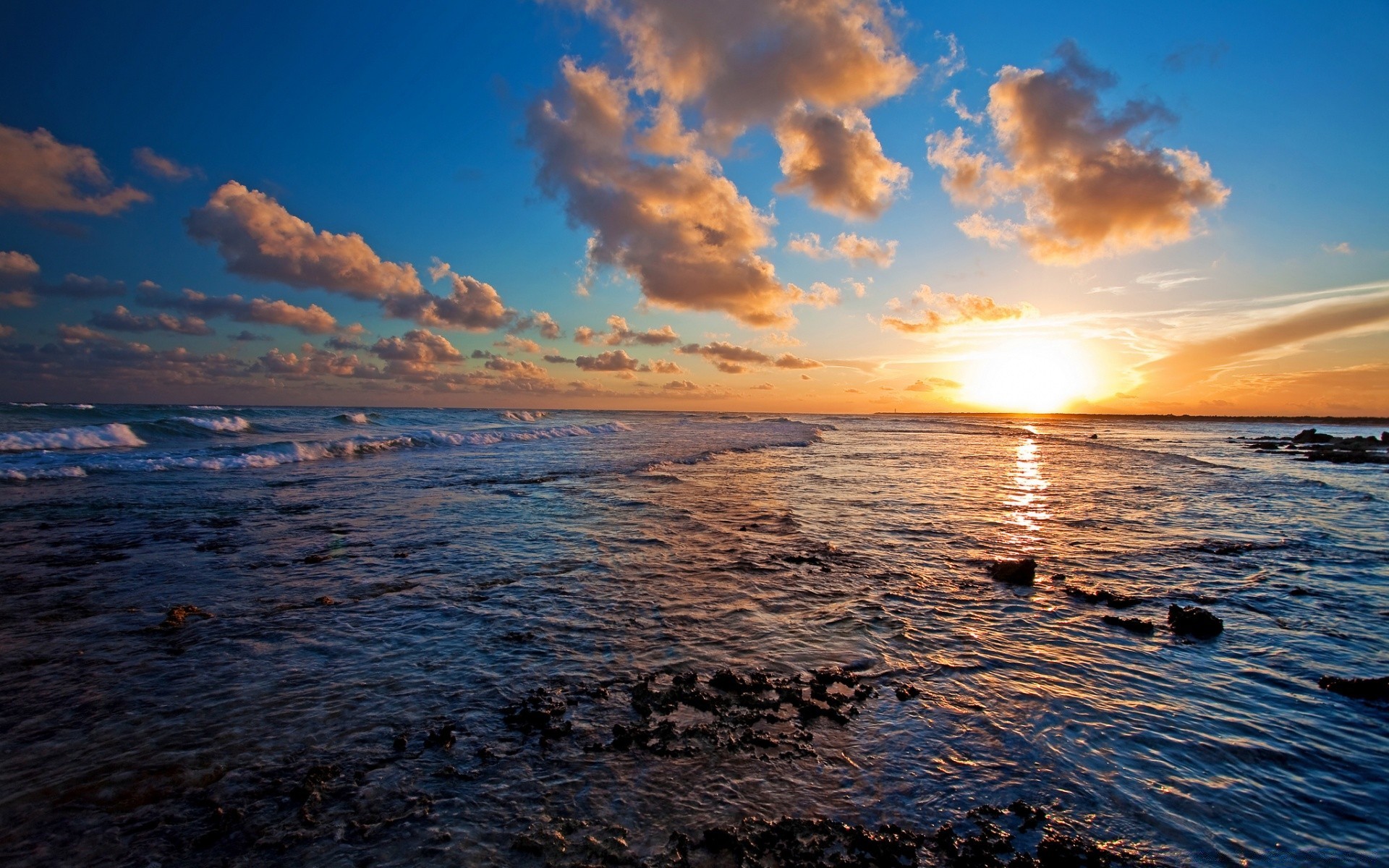 Praia rochosa do mar, céu do pôr do sol, névoa leve sobre a água