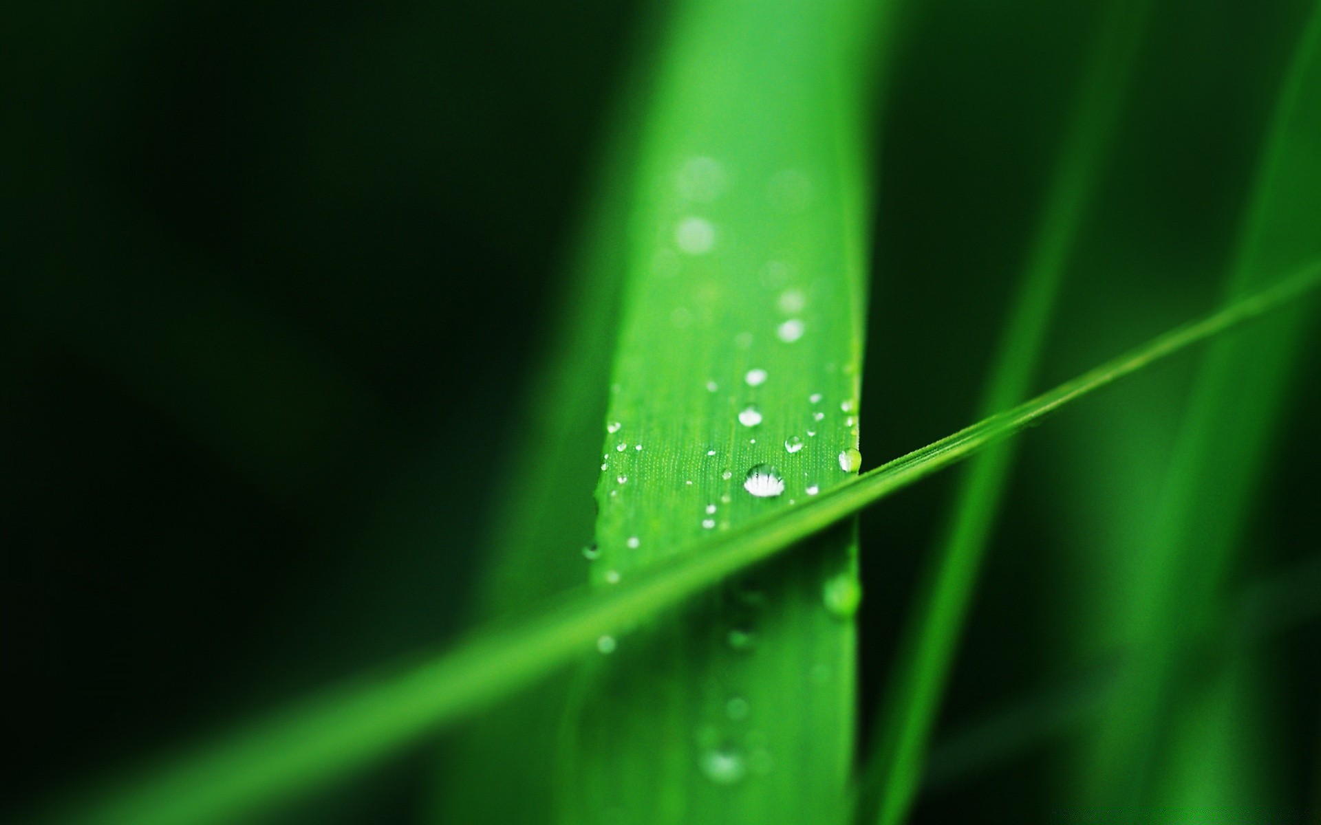 Fotografia Macro de uma folha de grama com uma pequena gota de orvalho