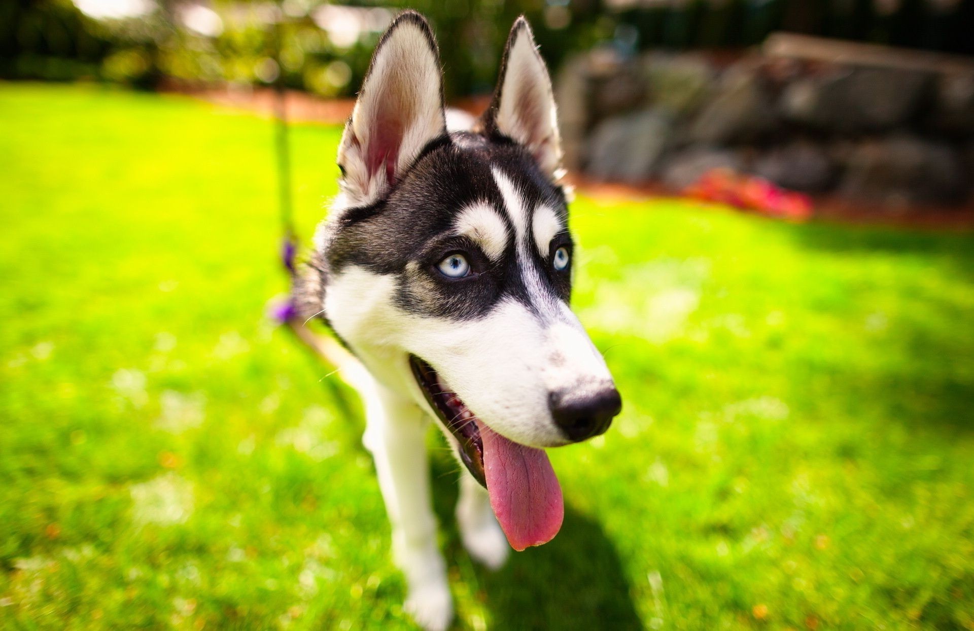 Passeio do cão na grama verde