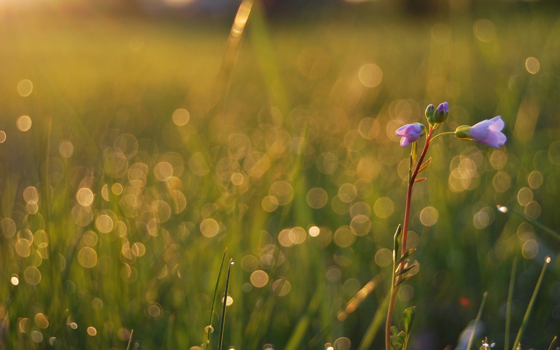 Gotas de orvalho na grama nos raios do sol do Meio-dia