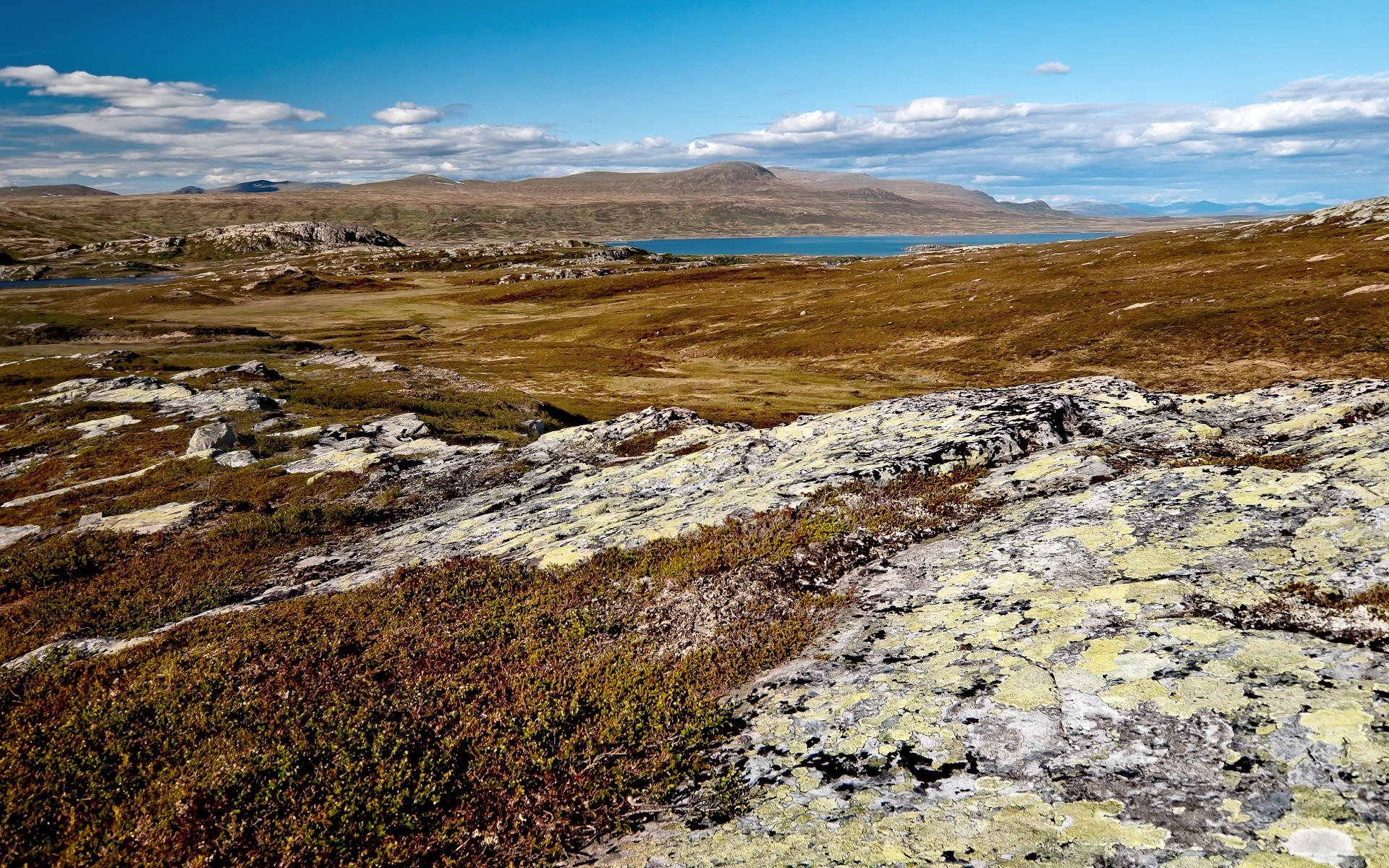 Lagoa cercada por campos de grama amarela e céu com nuvensLagoa cercada por campos de grama amarela e céu com nuvens