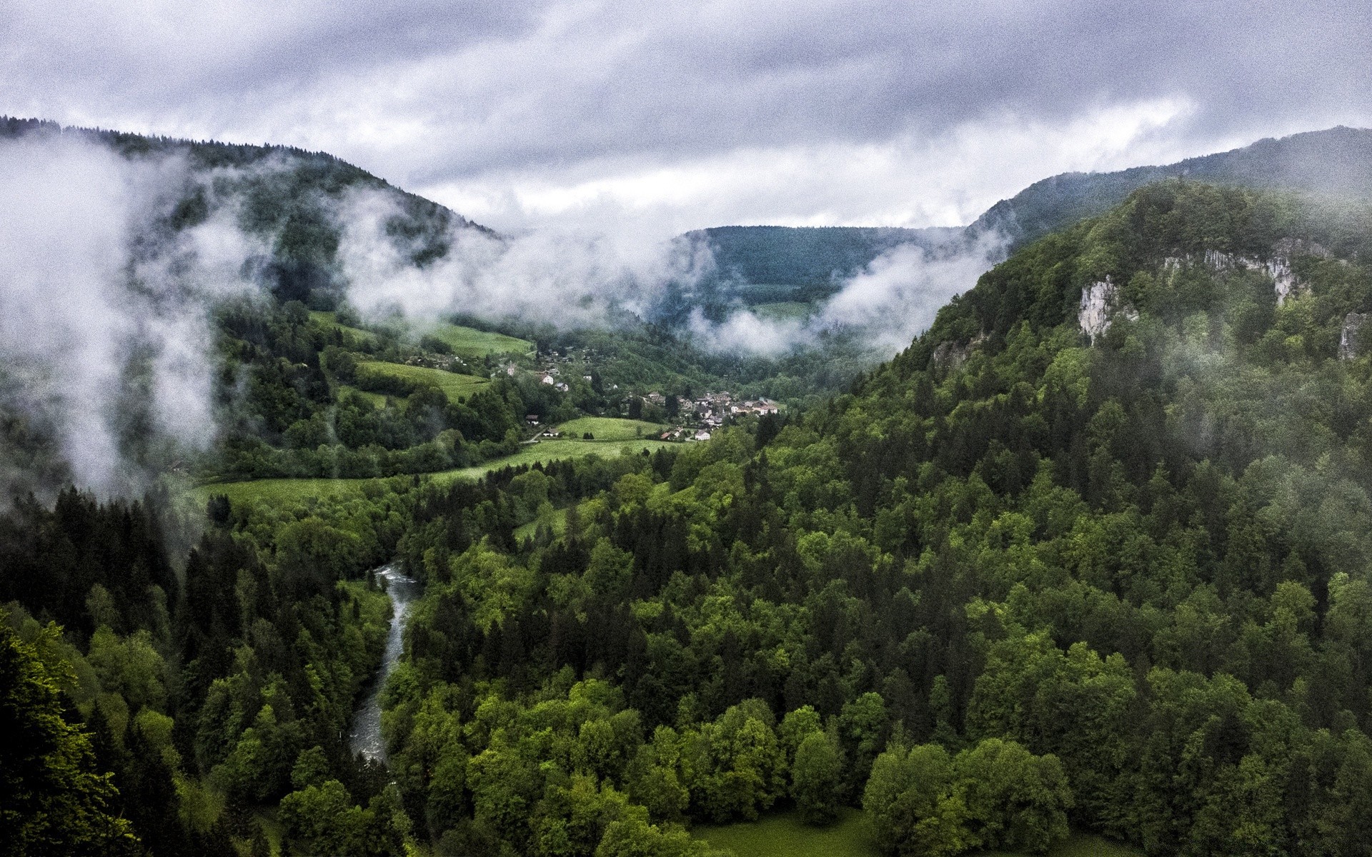 Paisagem montanhosa em nuvens nebulosas