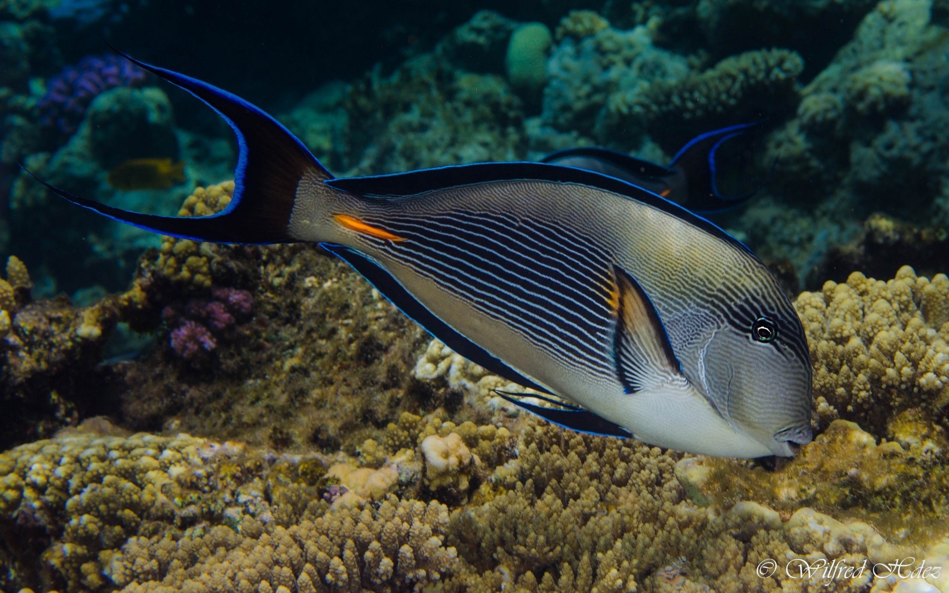Grande peixe nadando sobre um recife de coral