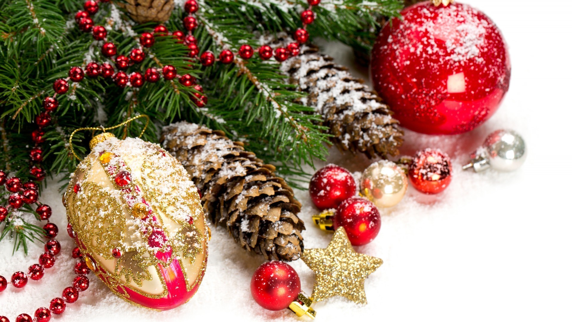 Brinquedos de Natal e cones em um galho na neve