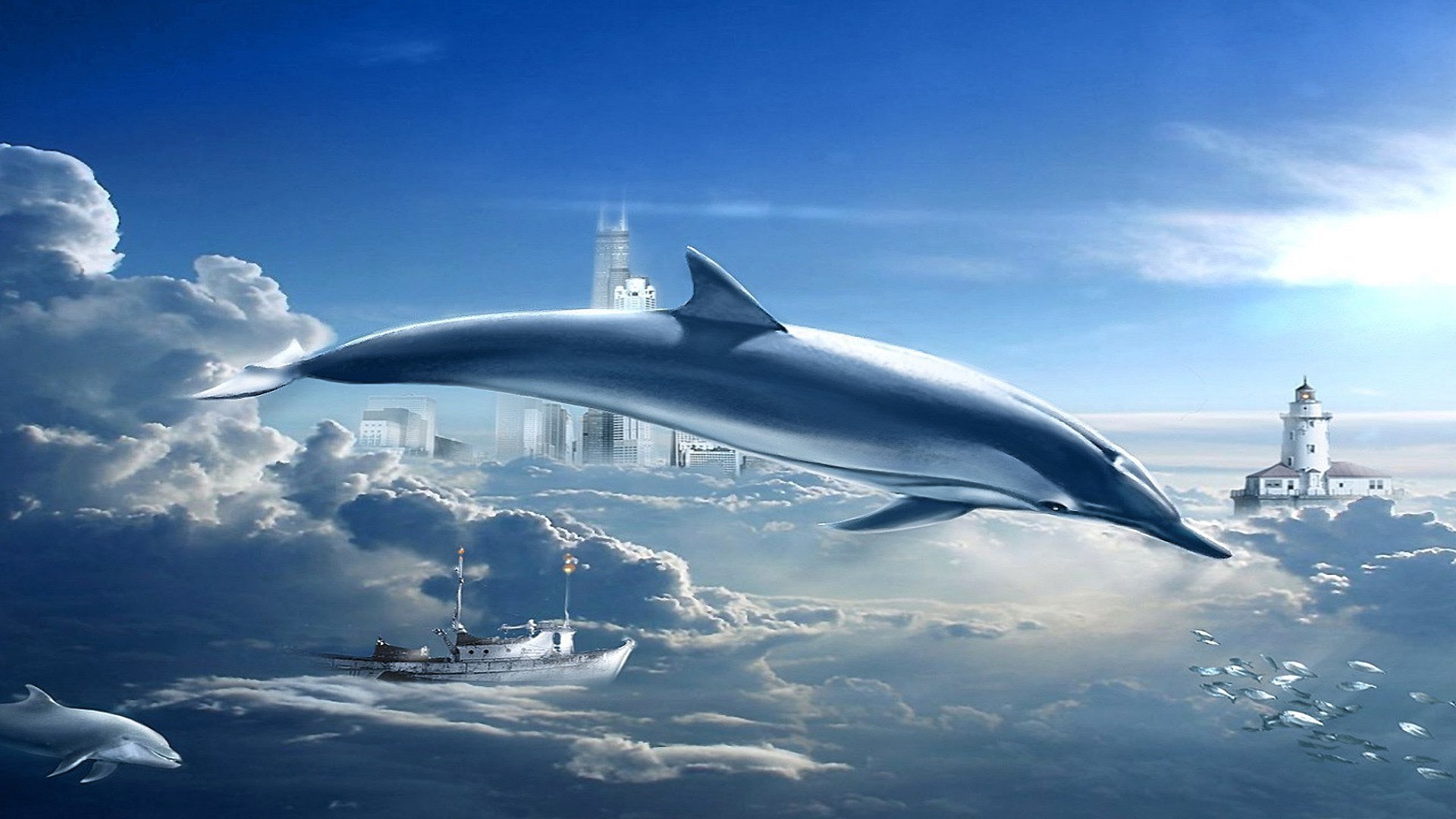Golfinhos no céu com nuvens. Fantasy. Quebra-gelos