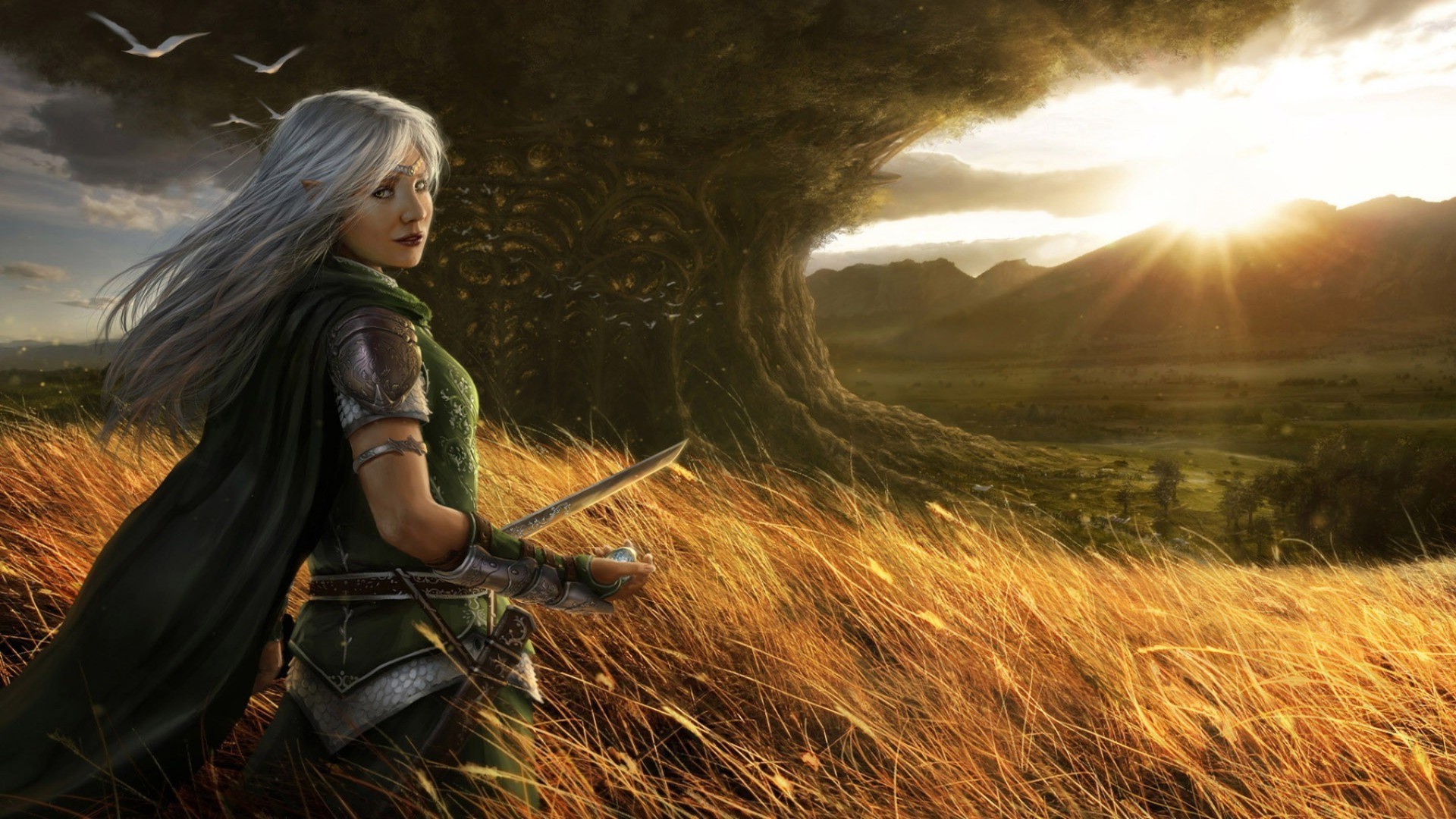 Elfo guerreiro garota perto de uma árvore