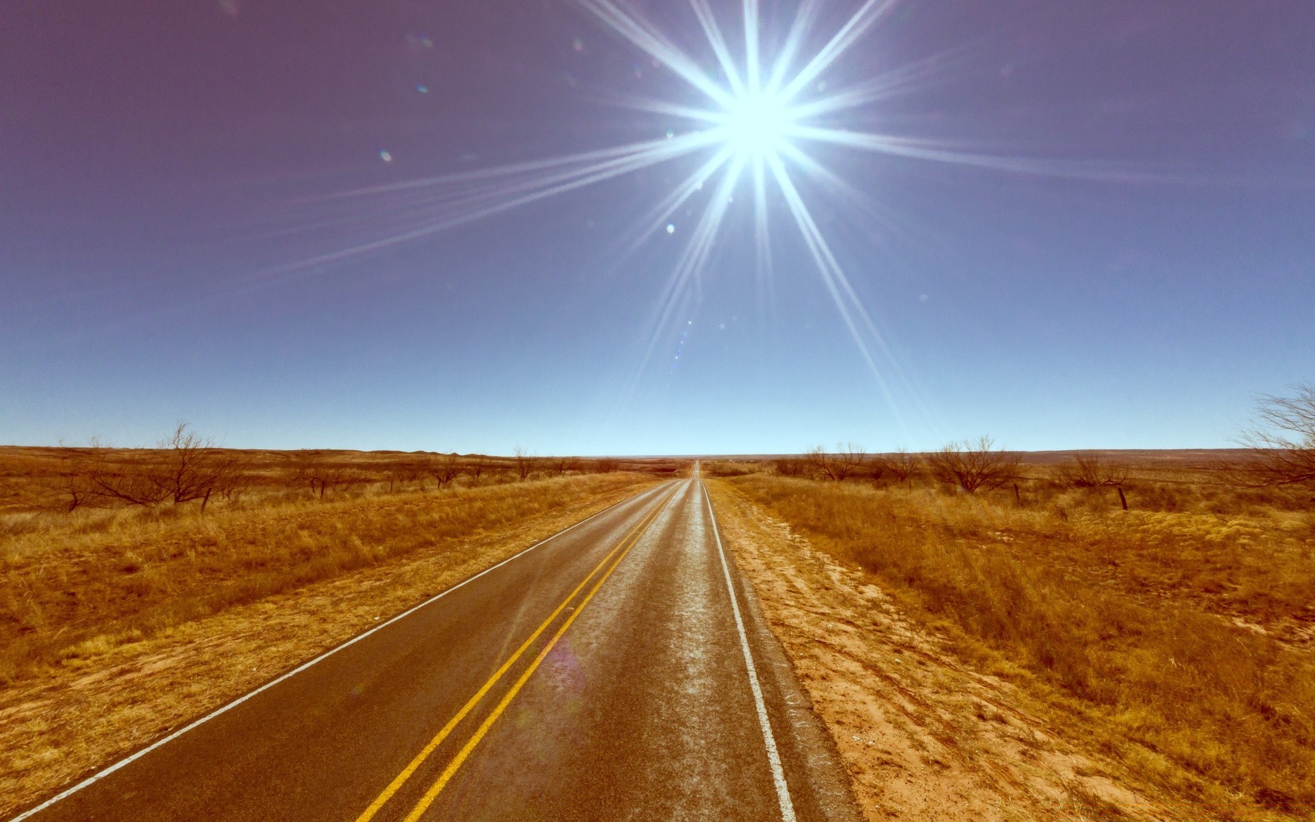 Um par de pessoas em uma motocicleta dirigindo na estrada que vai para o pôr do sol