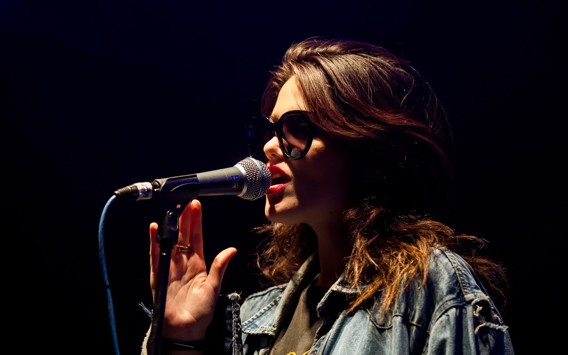 Músico de rua toca violão para transeuntes em pé contra uma parede de tijolos