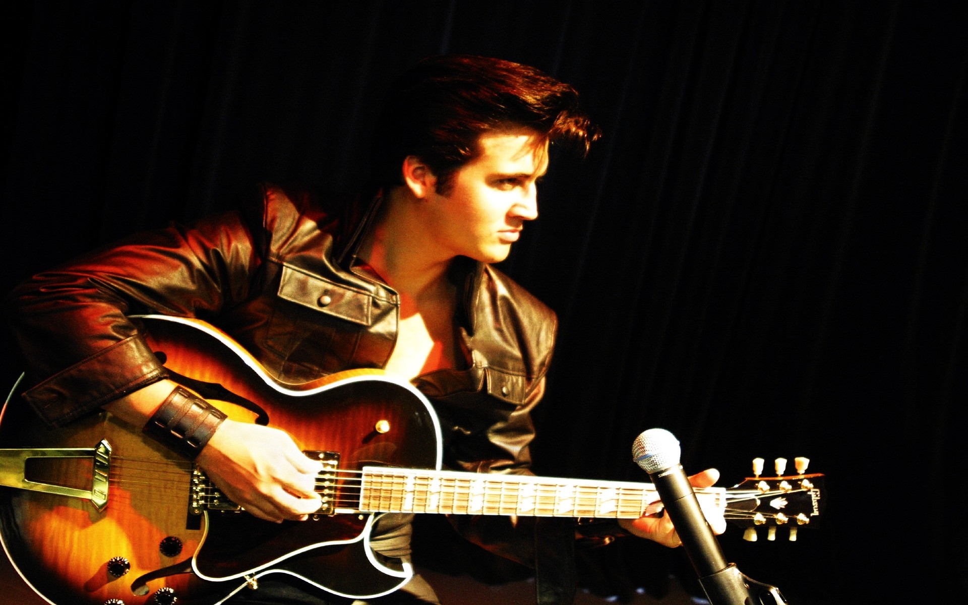 Músico em jaqueta de couro com guitarra
