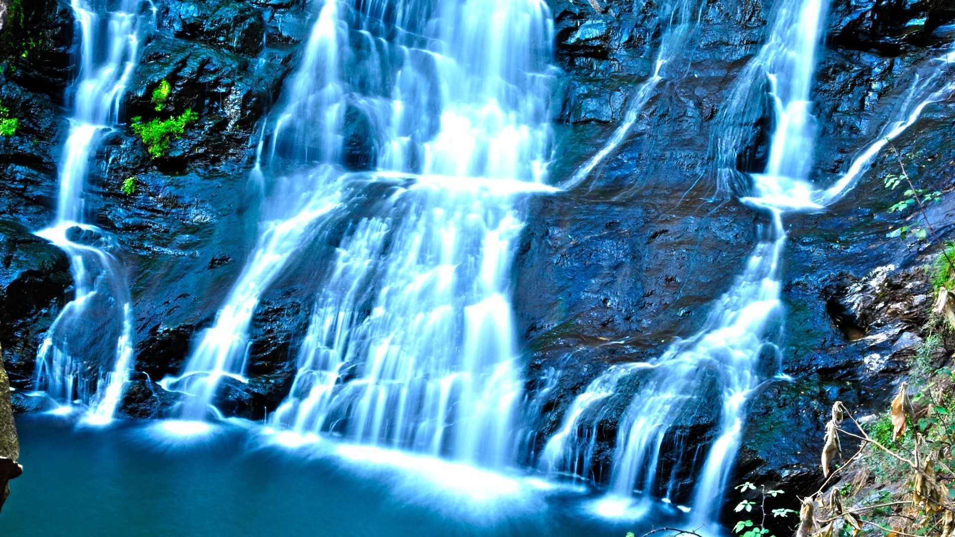 Uma cachoeira exuberante flui das montanhas para a fenda e os rios se dirigem para o oceano