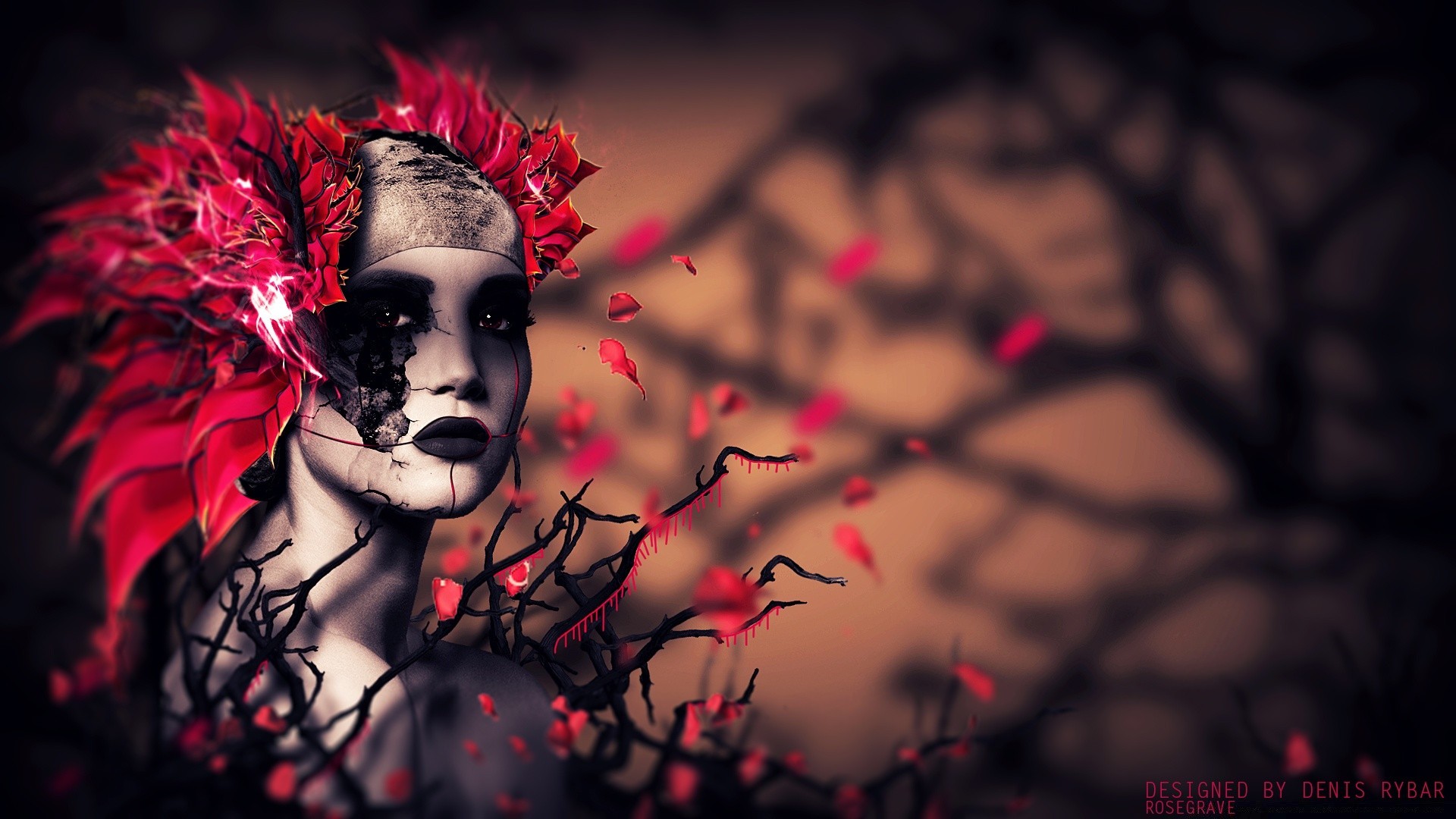 Menina de cabelos longos com uma espada no fundo de pássaros vermelhos e pretos voando