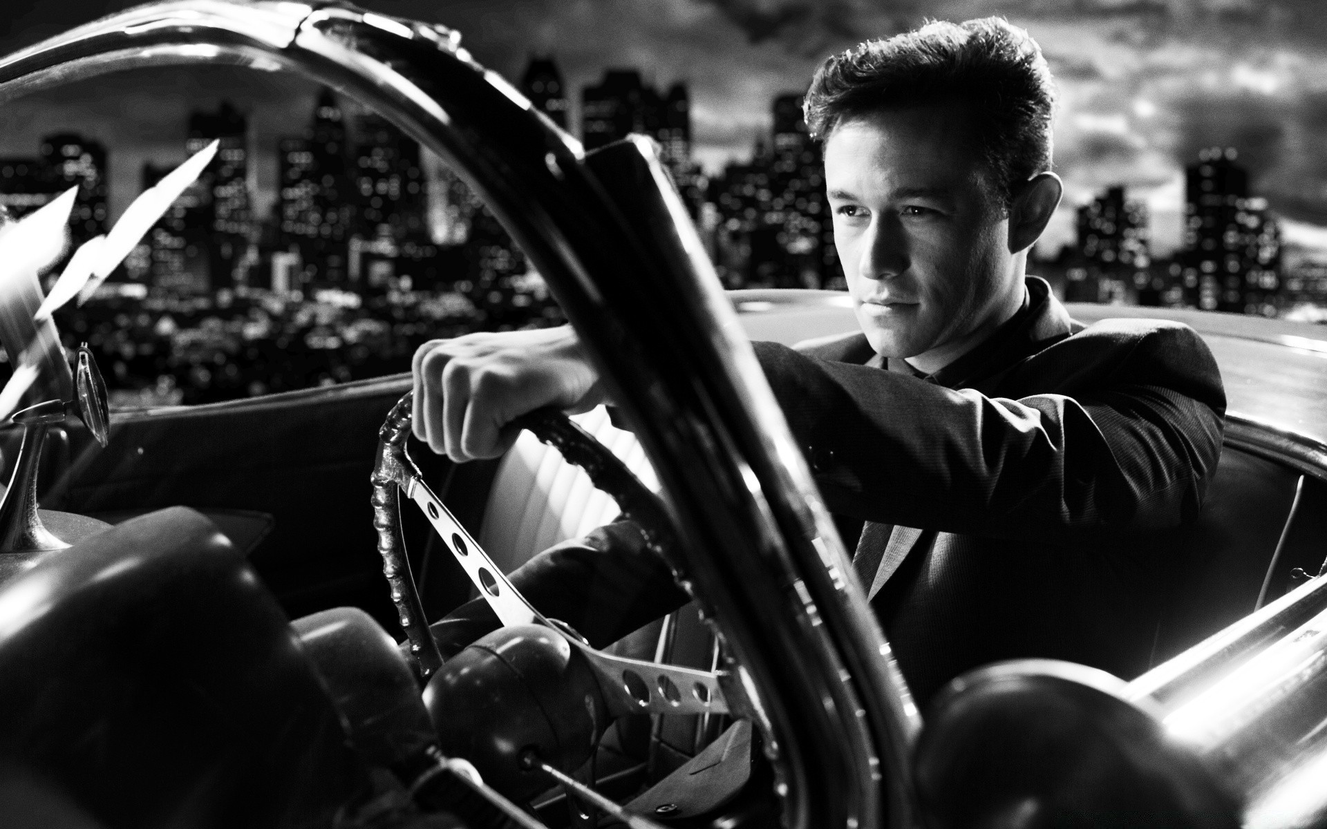 Retrato em preto e branco de um homem dirigindo um conversível