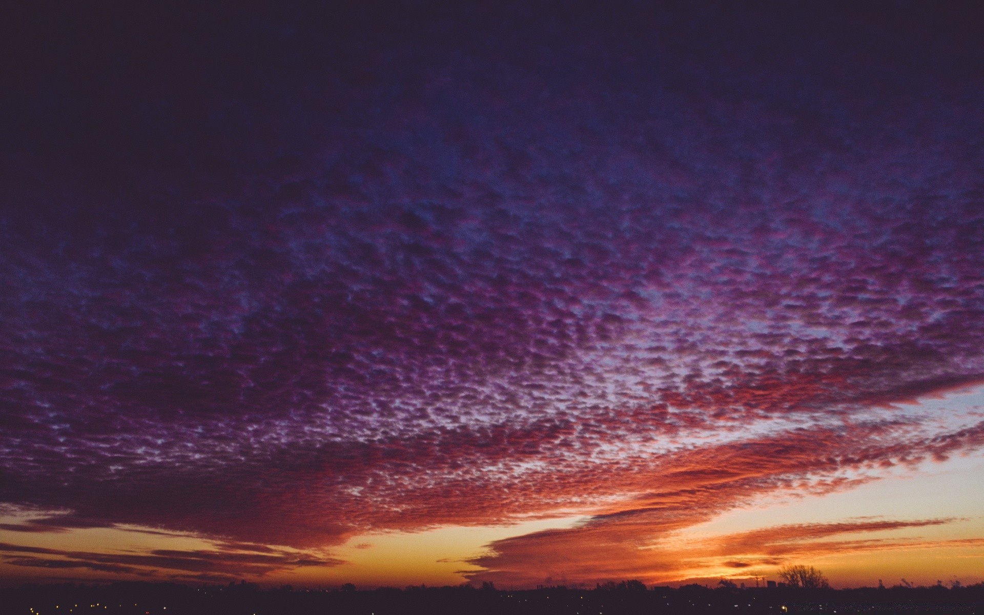 Nuvens púrpura em todo o céu, transformando-se em vermelho e laranja