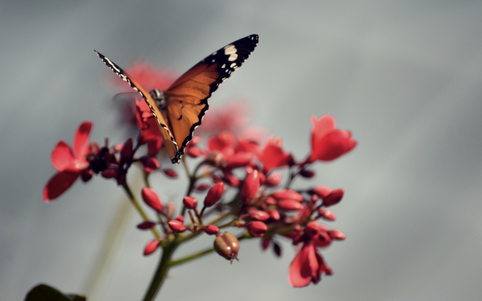 Uma borboleta vermelha senta-se em um ramo de flores amarelas