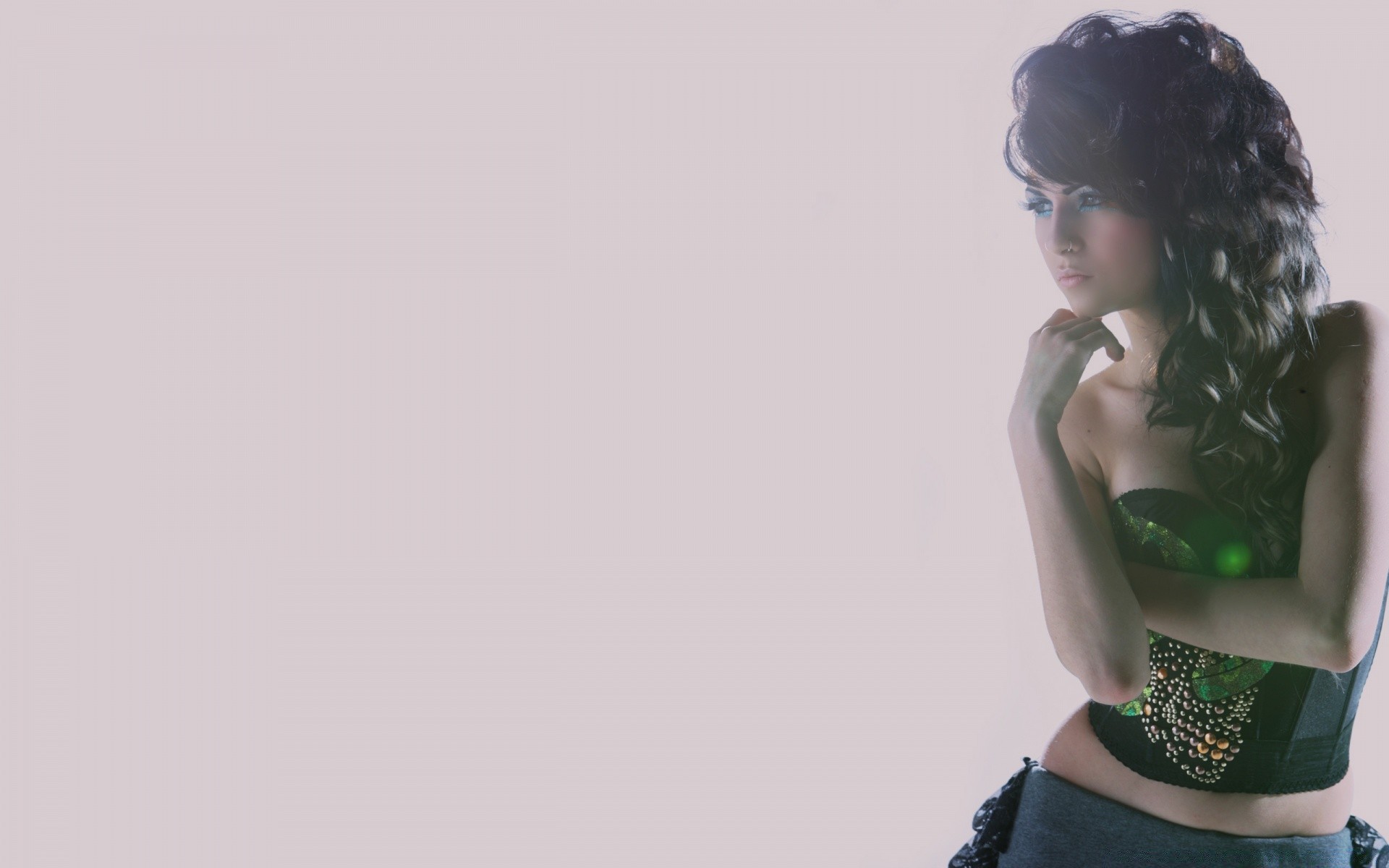Bela jovem morena em Top com barriga aberta em fundo bege