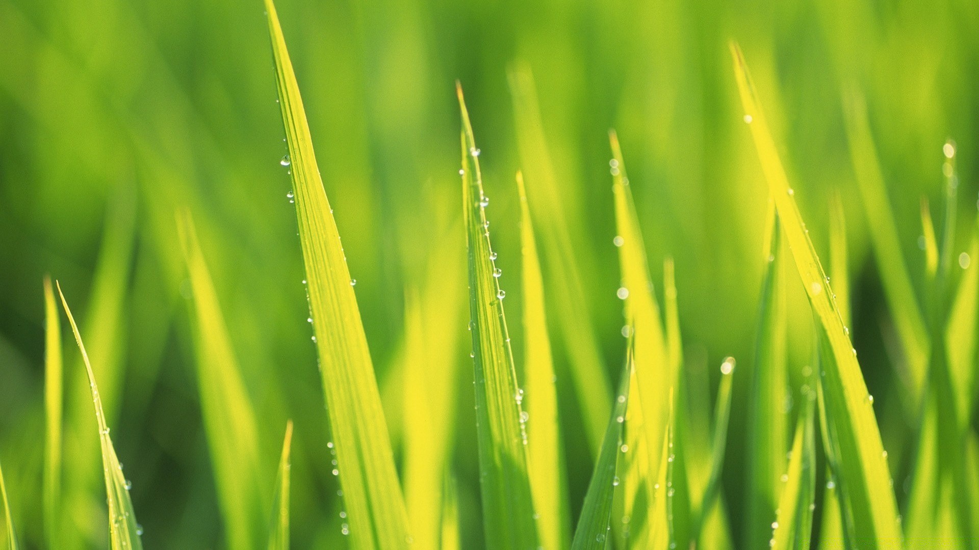 Grama jovem verde com gotas de orvalho nos raios do sol