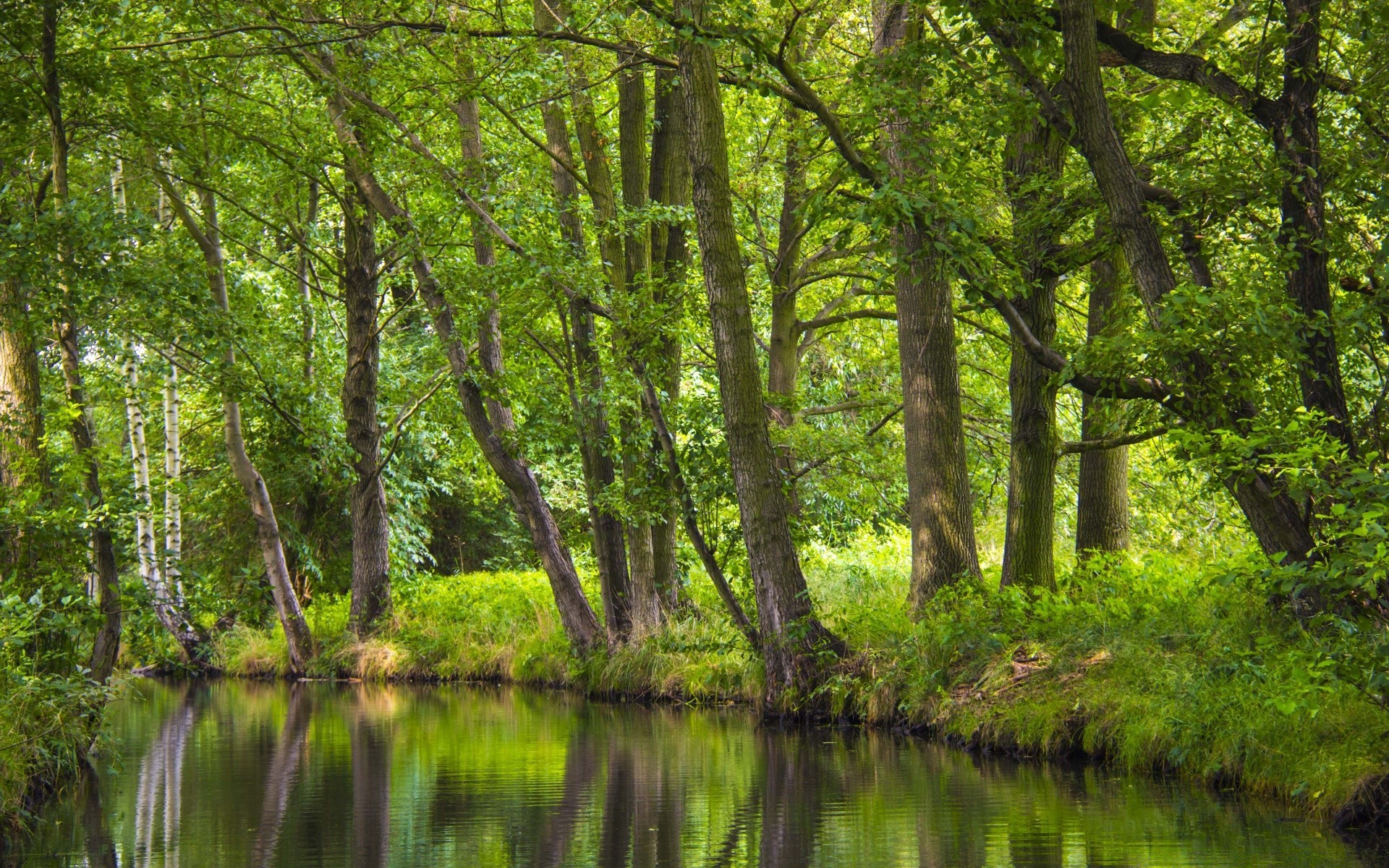 Lago entre as colinas verdes. Céu azul e nuvens brancas