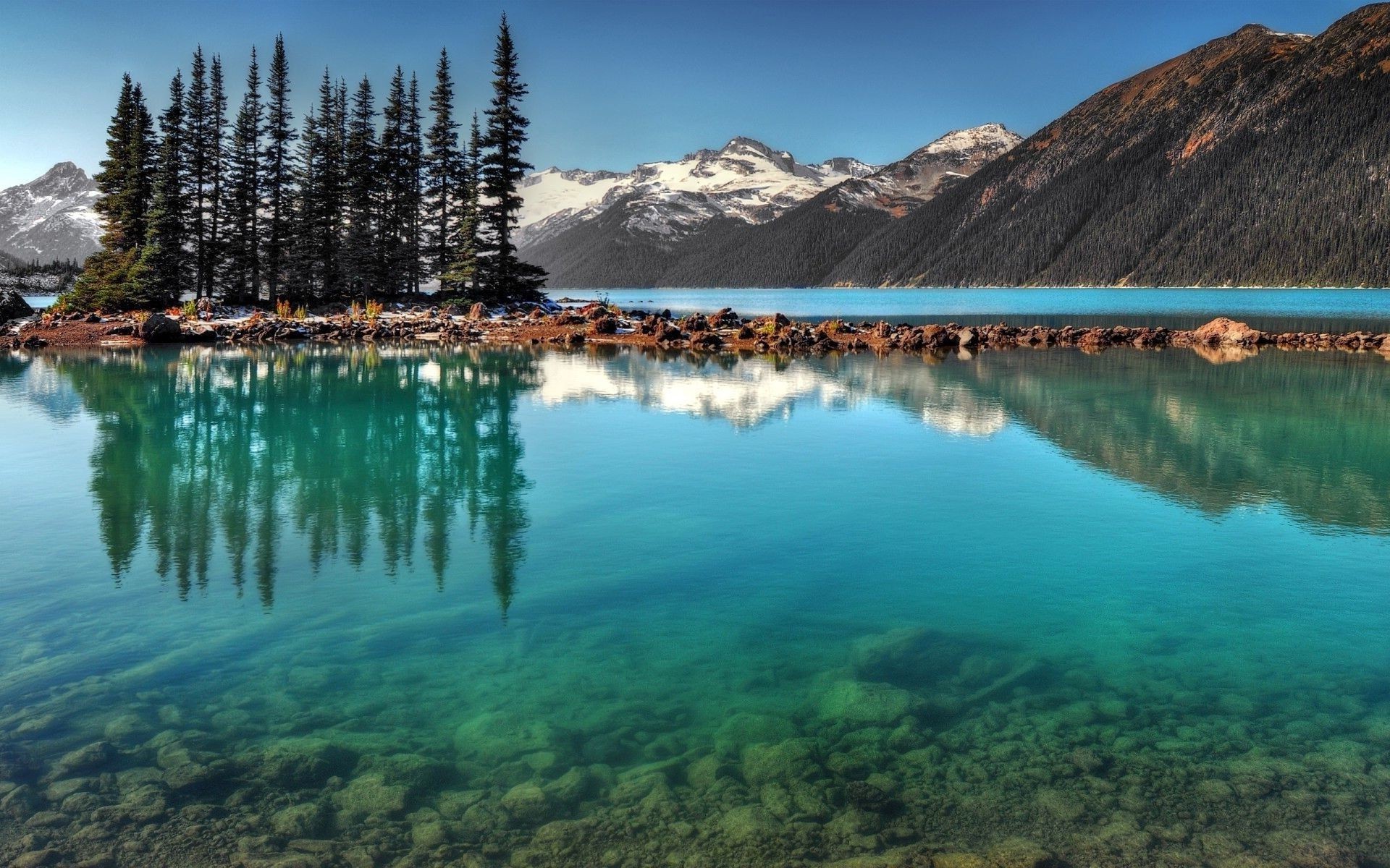 Reflexão da floresta e das montanhas no lago contra o céu cinzento