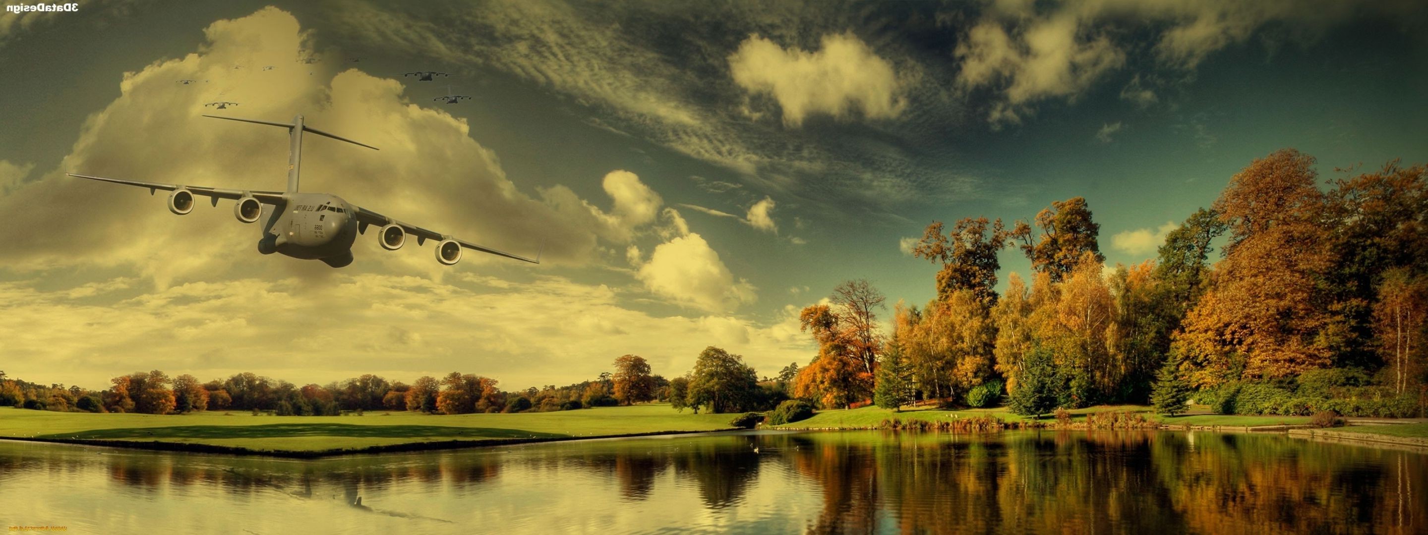 Avião de carga descendo sobre um lago fabuloso