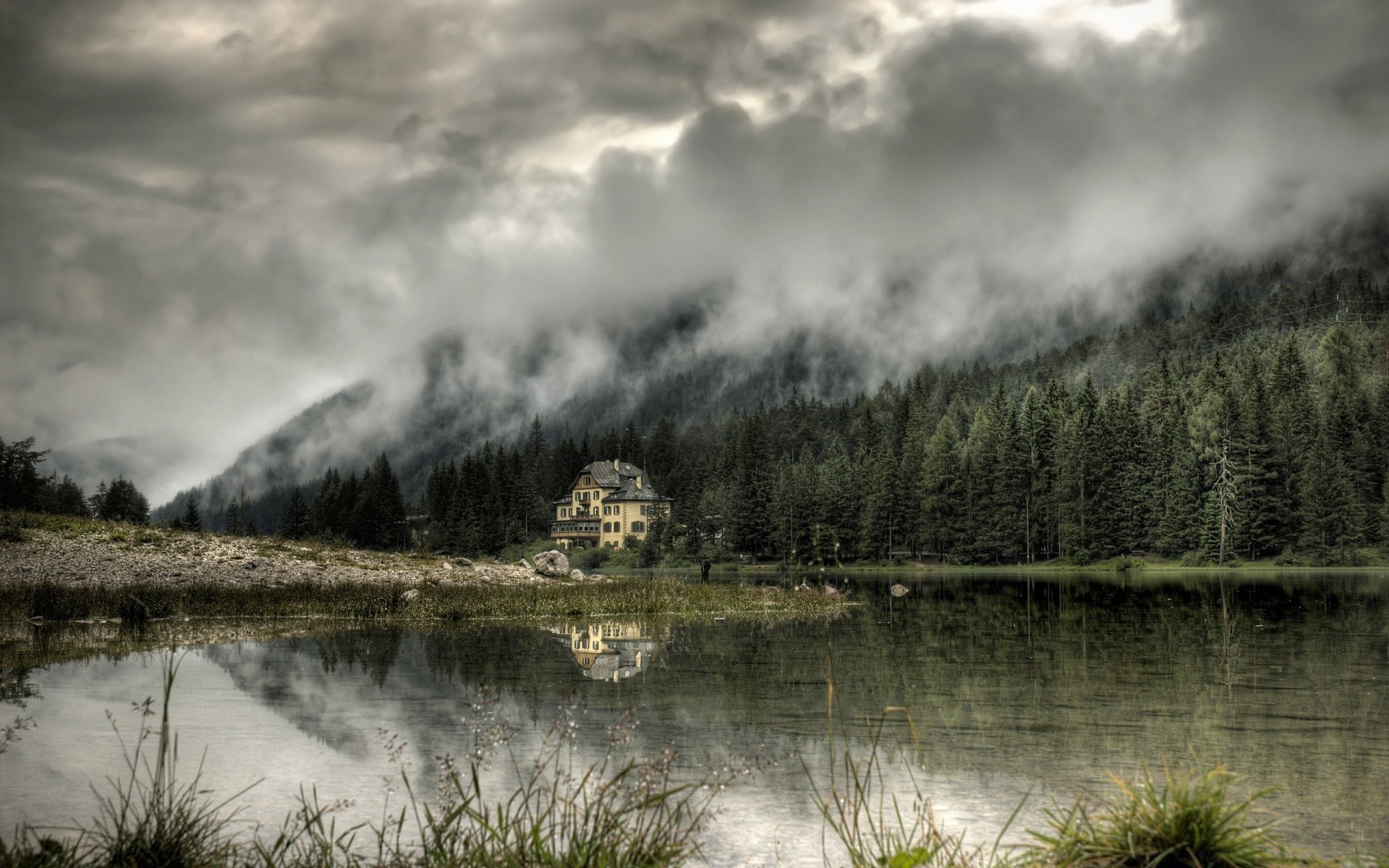 Árvore solitária perto do lago entre as montanhas no fundo do pôr do sol
