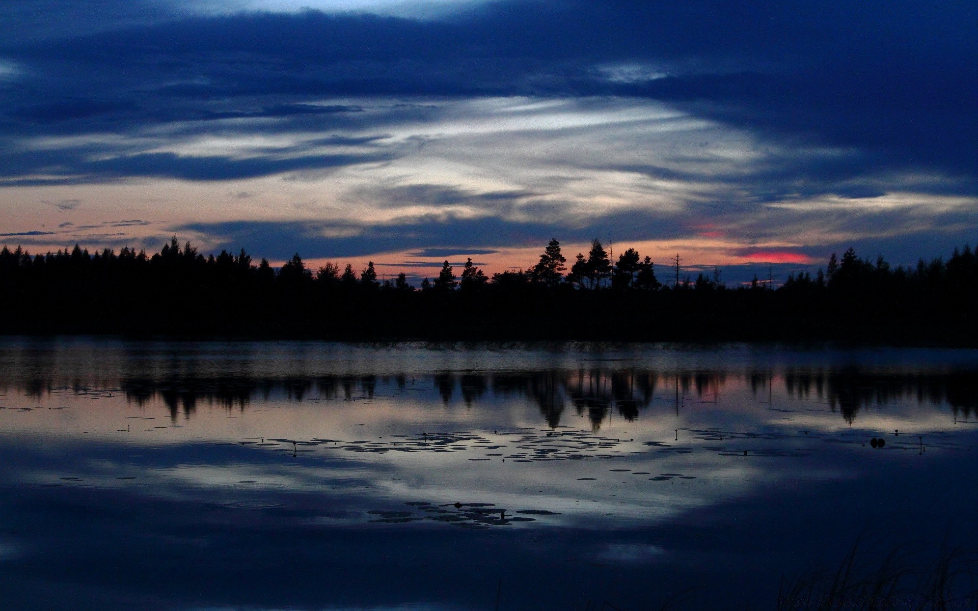 Reflexão do pôr do sol na paisagem do lago da floresta