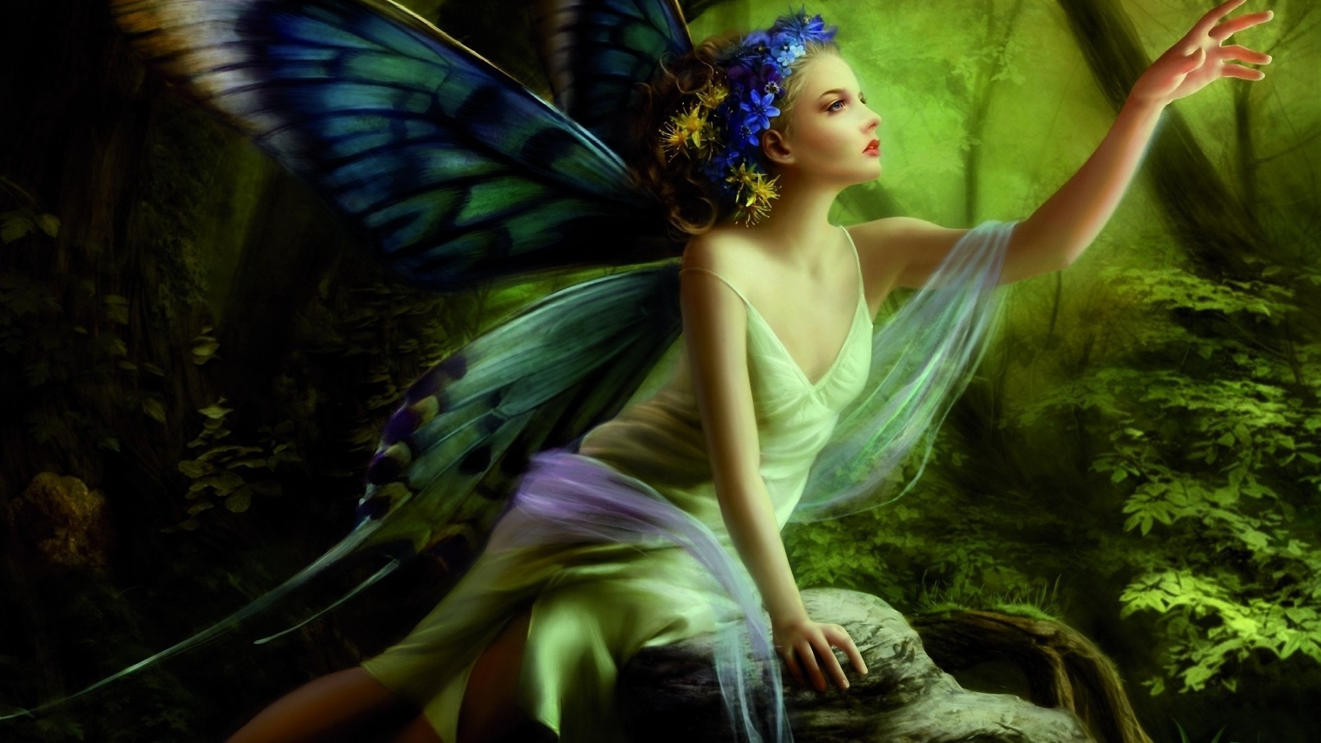 Menina em um vestido verde com asas de borboleta