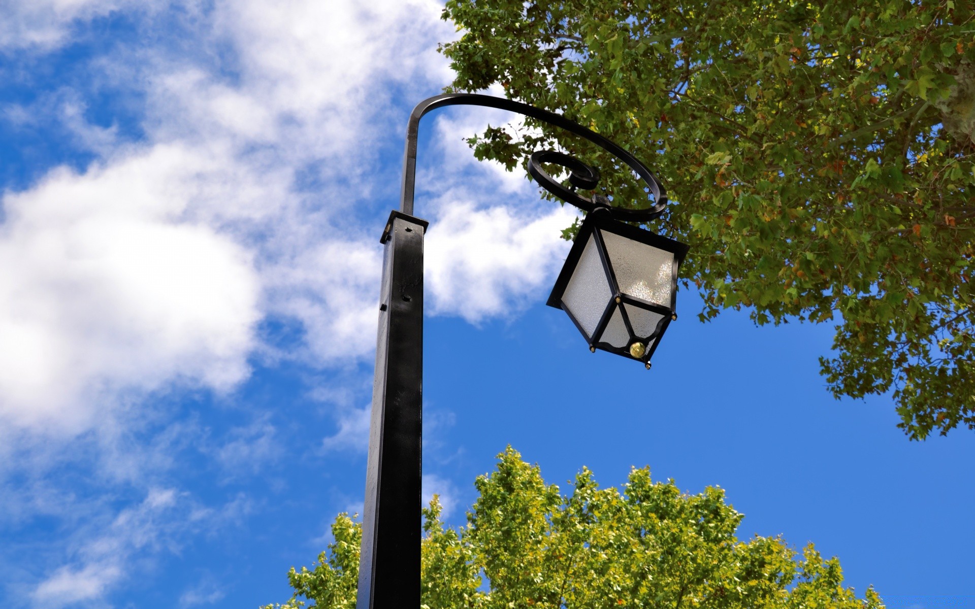 Lanterna e silhuetas de árvores contra o céu do pôr do sol