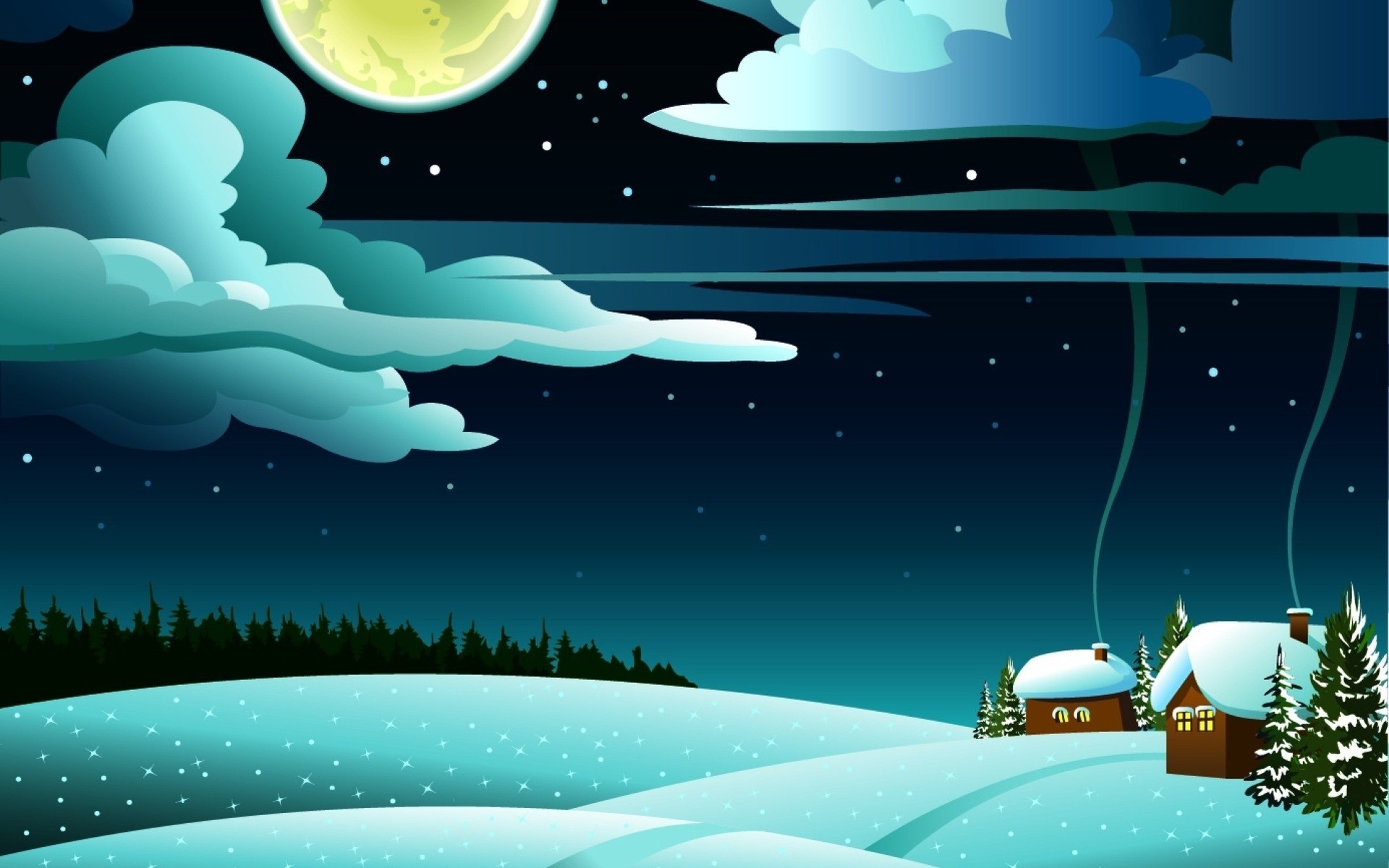 Imagem de uma aldeia de noite de inverno com uma névoa de chaminés de Cabanas