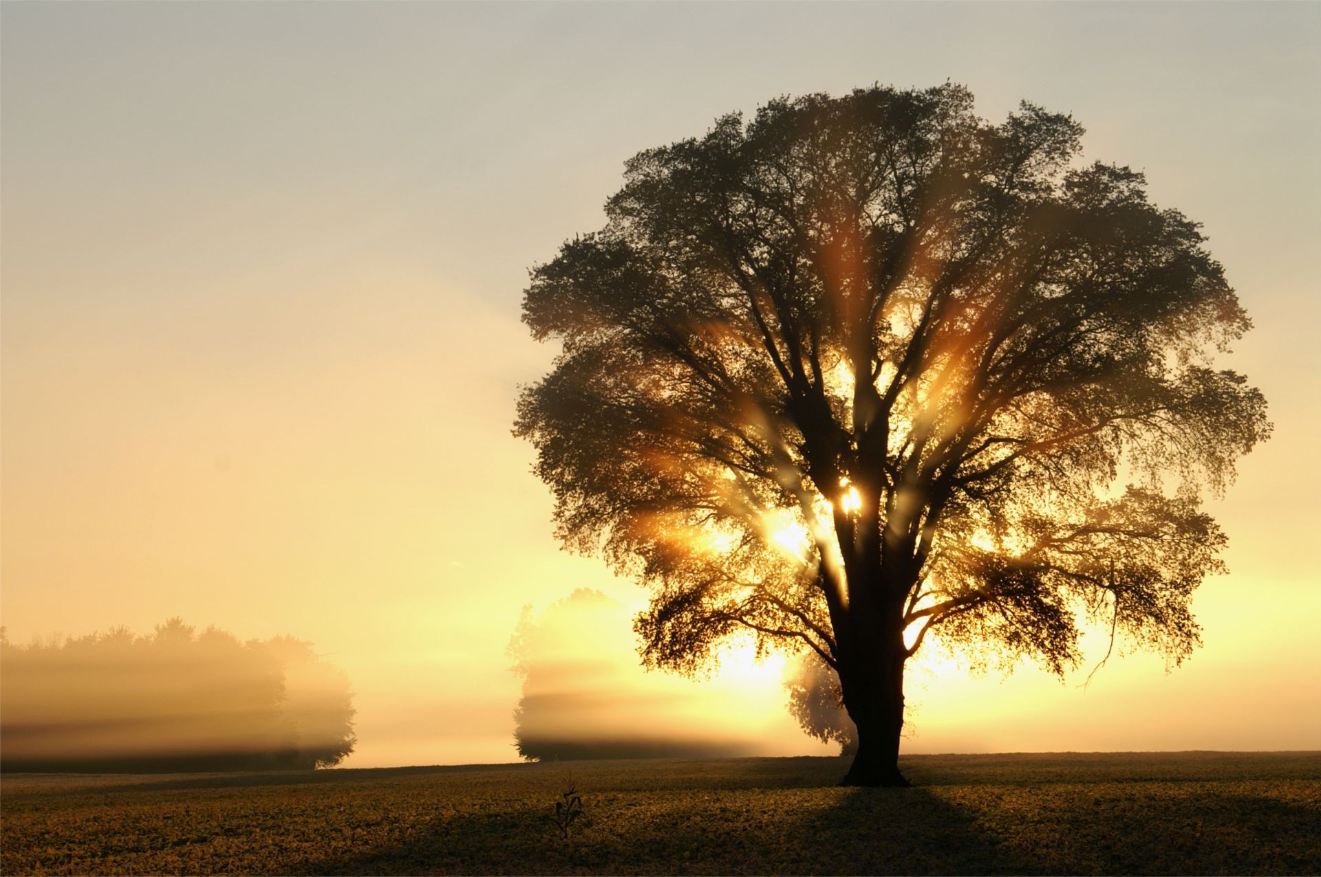 Um rebanho de elefantes caminha para um abrigo sob a luz do sol poente