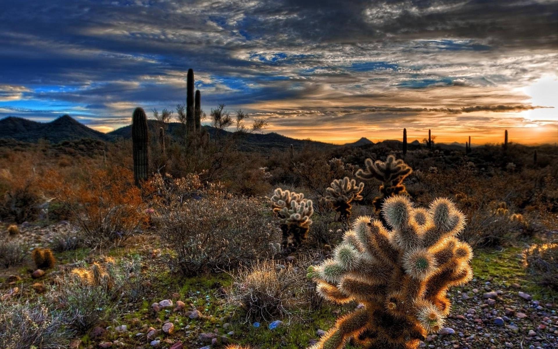 Deserto com cactos. O pôr-do-sol está no céu. fa