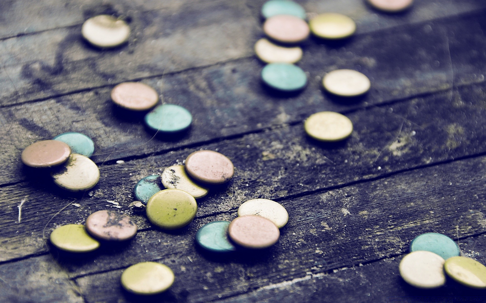 Objetos coloridos redondos em tábuas de madeira escurasObjetos coloridos redondos em tábuas de madeira escuras