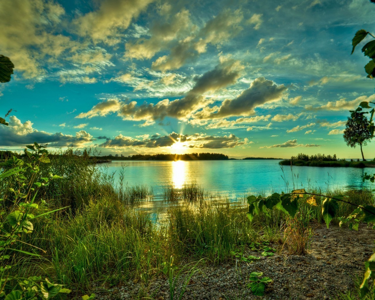 Pôr do sol refletido na água com moinhos de vento ao longo da costaPôr do sol refletido na água com moinhos de vento ao longo da Costa