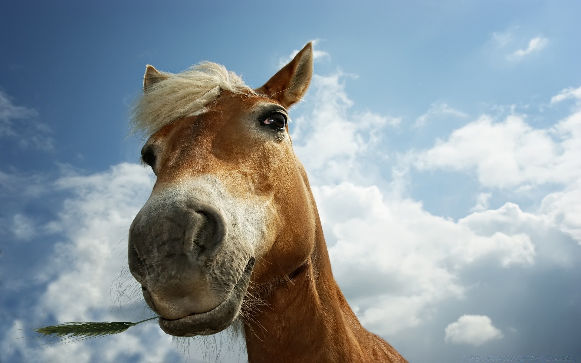 Um cavalo com cascos brancos. Céu bonito azul