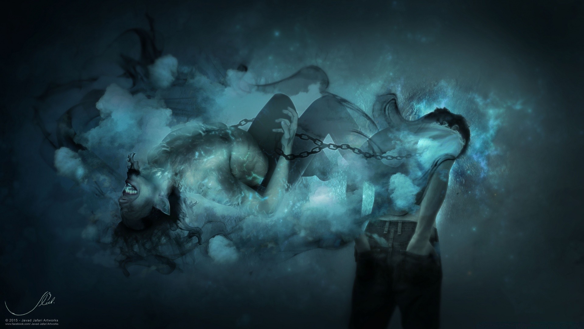 Homem acorrentado contra uma nebulosa azul