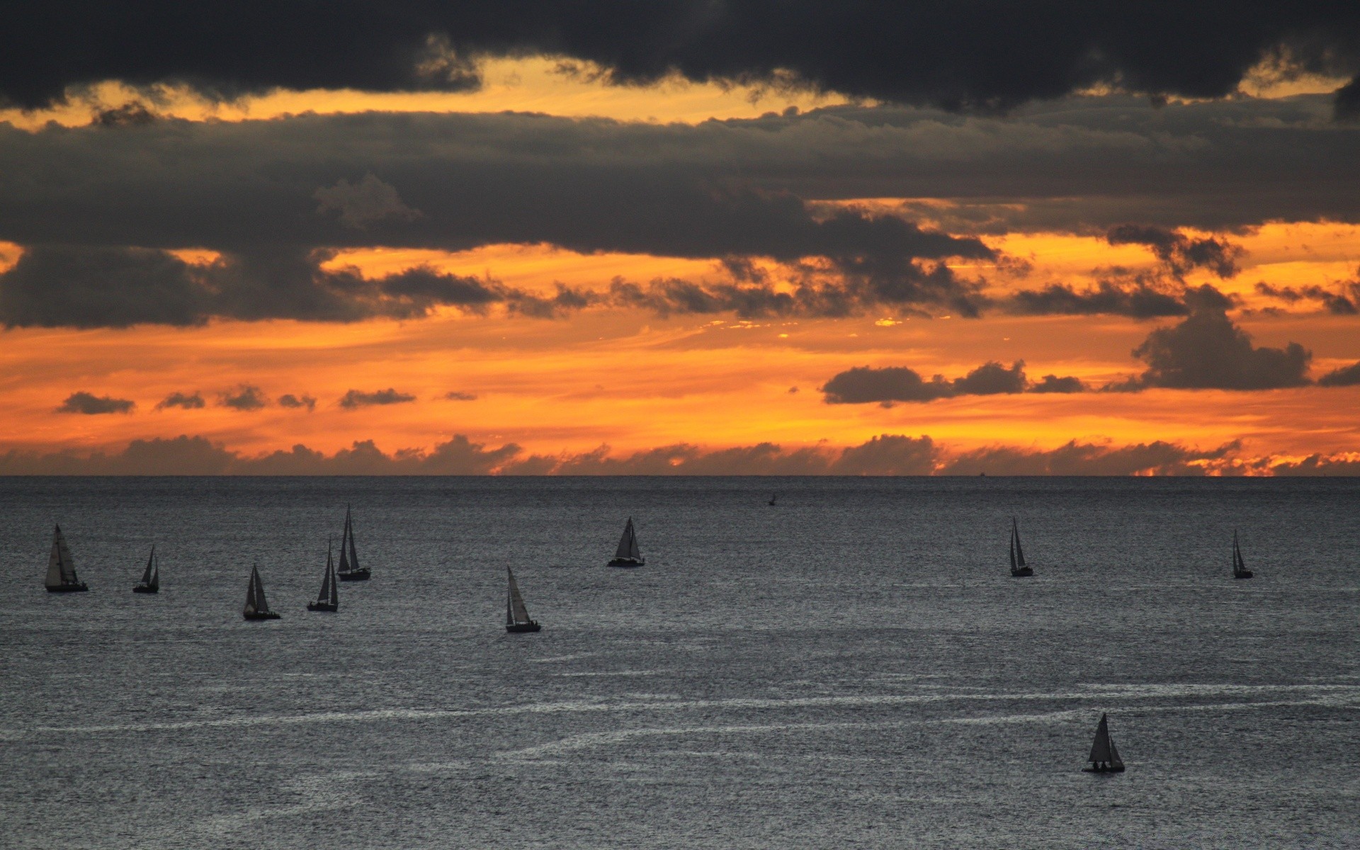 Barcos no oceano em meio ao pôr do sol