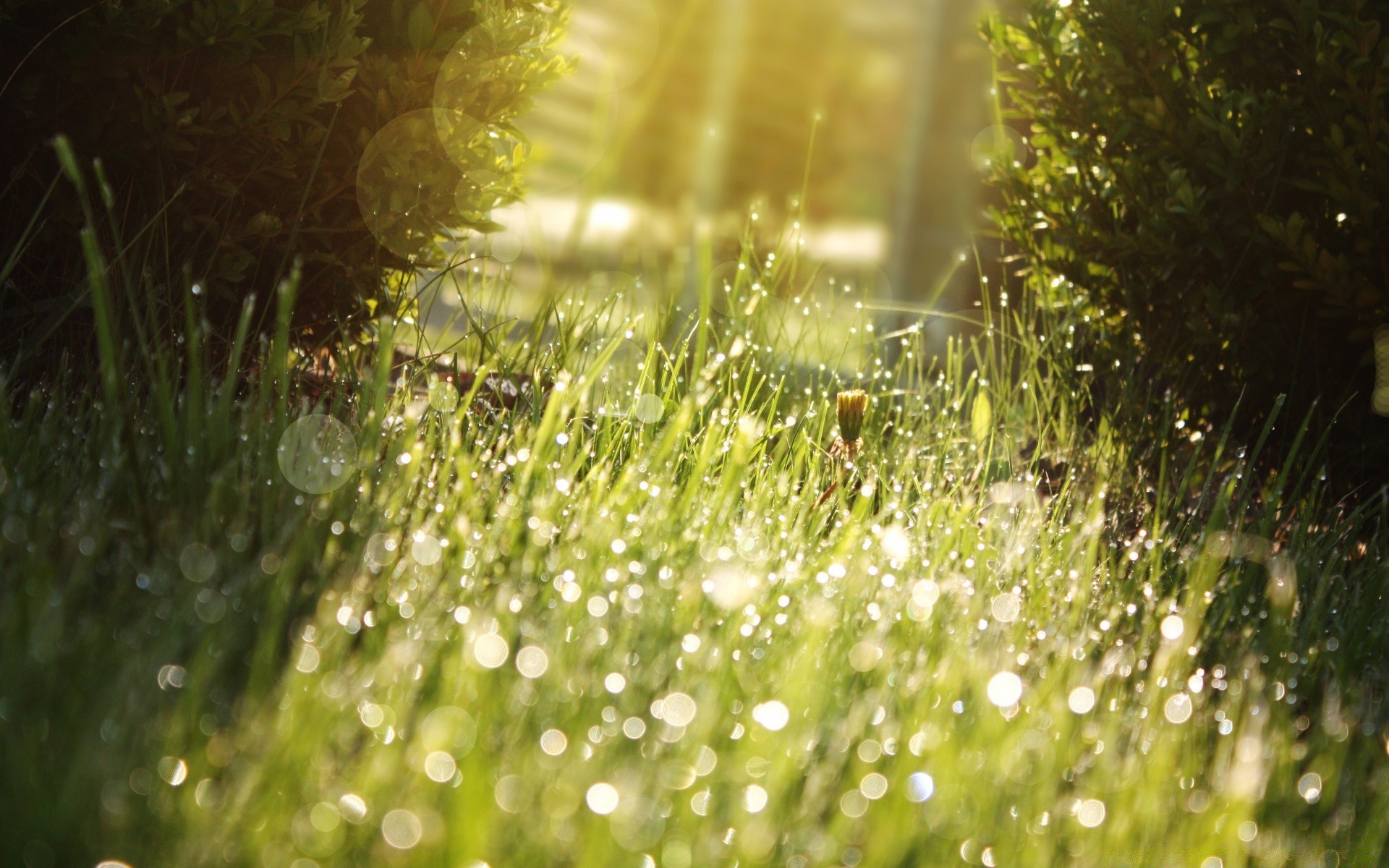 Gotas de orvalho na grama nos raios do sol do Meio-dia