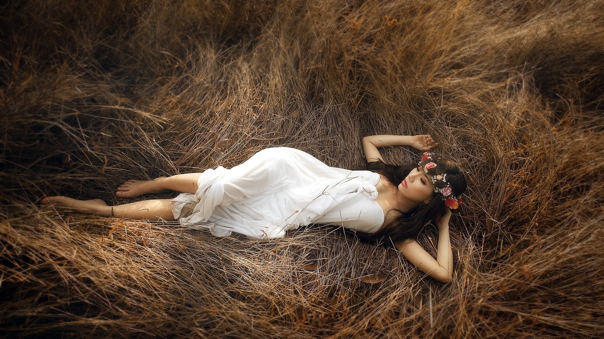 Menina em vestido branco deitado na grama seca