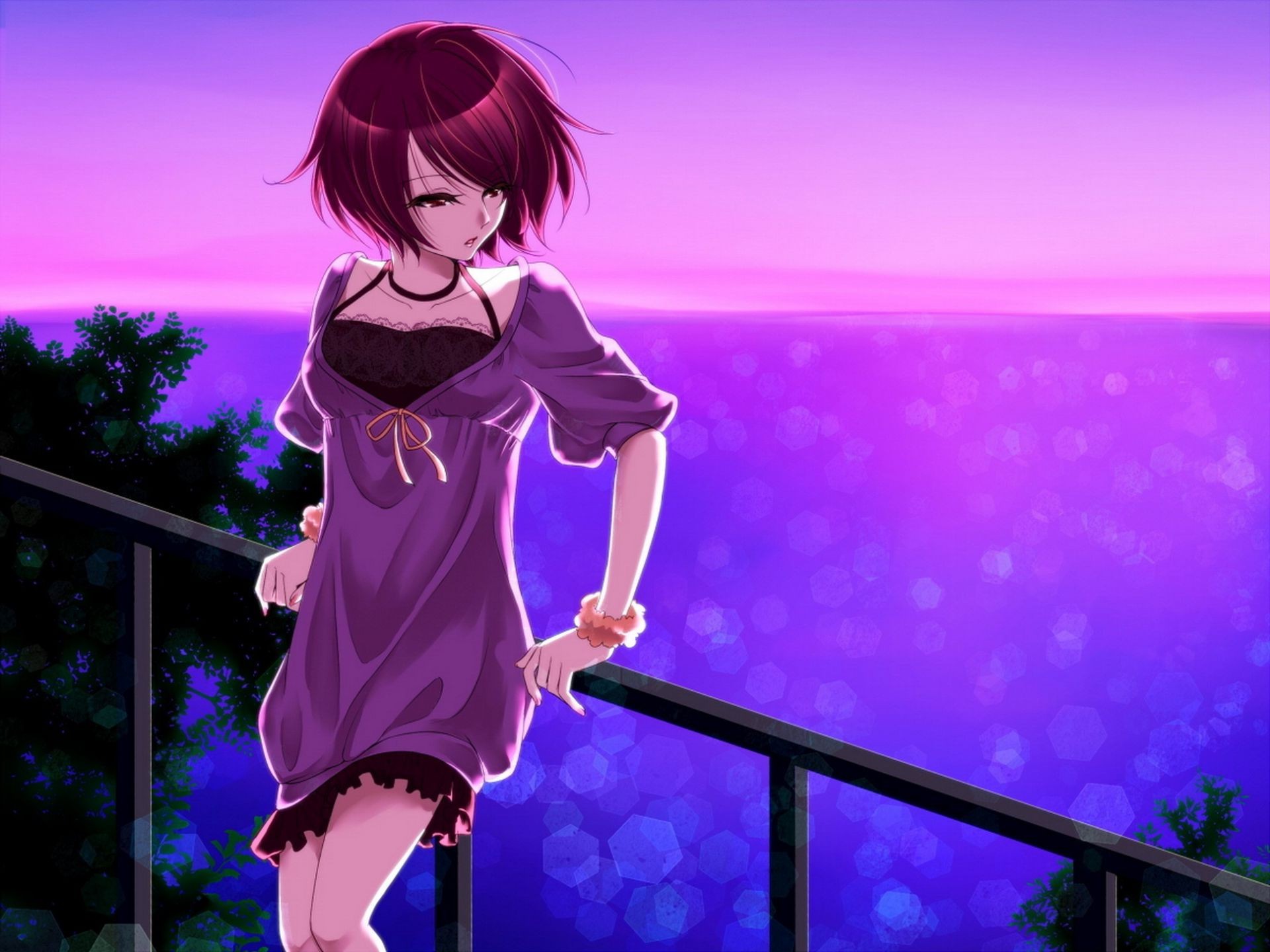 Anime-menina no corrimão sobre o mar